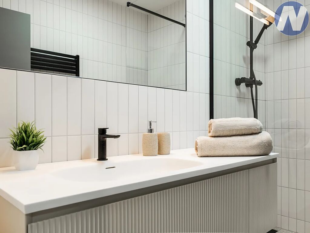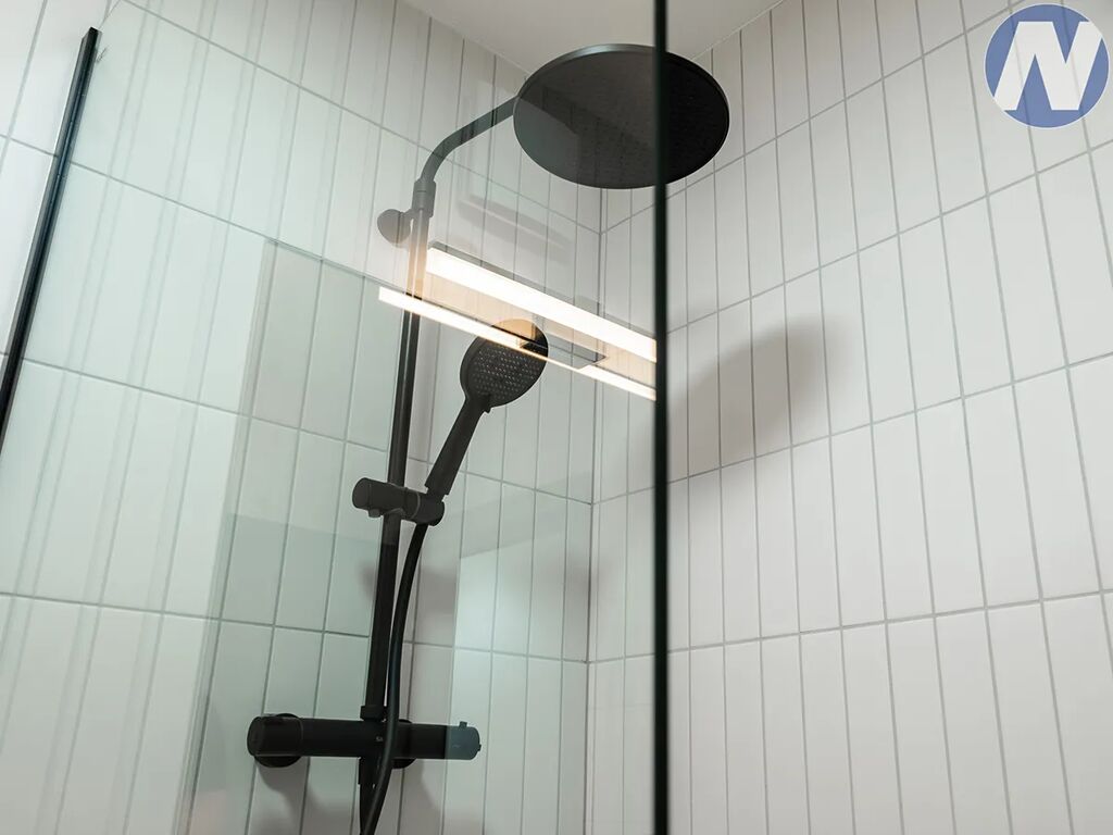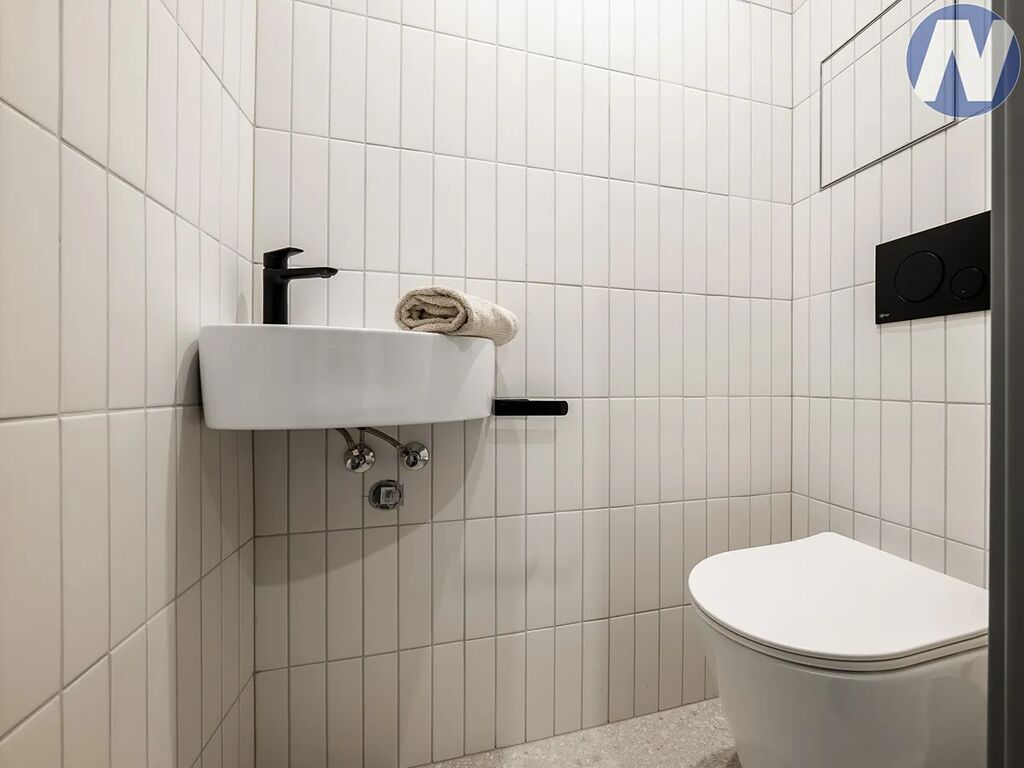 Koupelna a toaleta prošly rovněž kompletní rekonstrukcí – najdete zde moderní obklady, sprchový kout a sanitární vybavení v elegantní černé kombinaci.