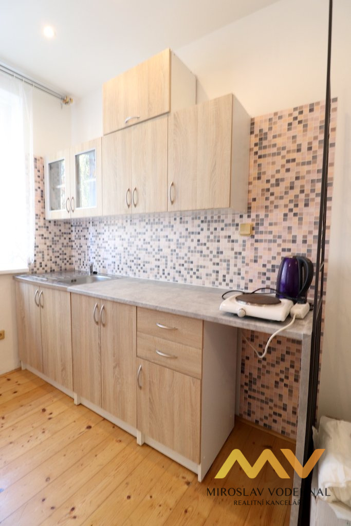 Jedná se o částečně zařízený byt s odděleným prostorem na spaní. Kuchyňský kout vybaven novou kuchyňskou linkou, vaření na dvojplotýnkovém vařiči. Koupelna je nová, se sprchovým koutem, umyvadlem a koupelnovým zrcadlem, toaletou), přípojka na pračku.