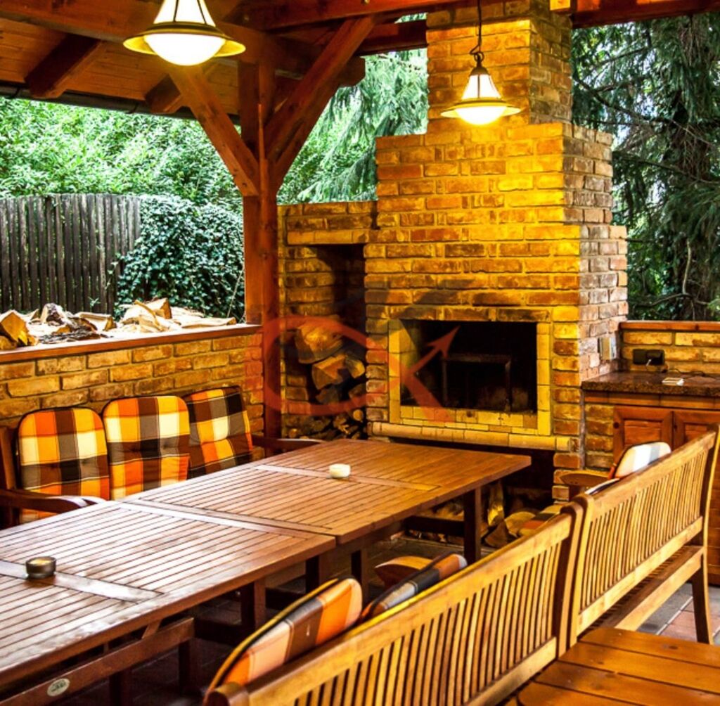 Součástí je udržovaná zahrada s krytým venkovním posezením, grilem a venkovní kuchyní vybavenou lednicí. K dispozici je také garáž/sklad pro uložení sportovního vybavení.