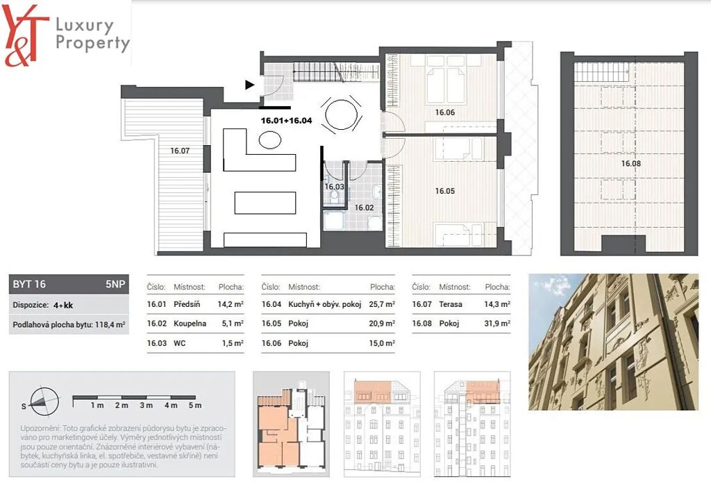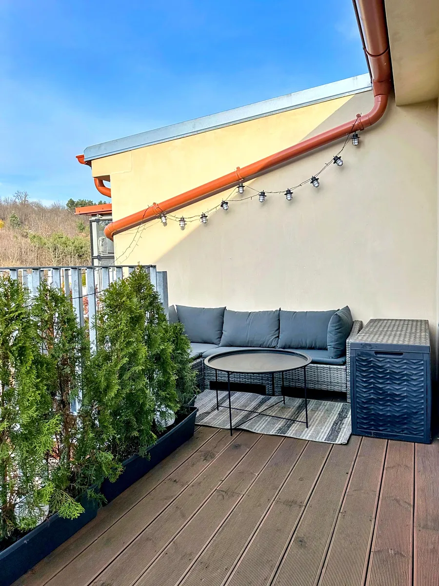 Prodej mezonetového bytu 4+kk o podlahové ploše 118,4 m² s terasou 14,3 m² orientovanou na severozápad.