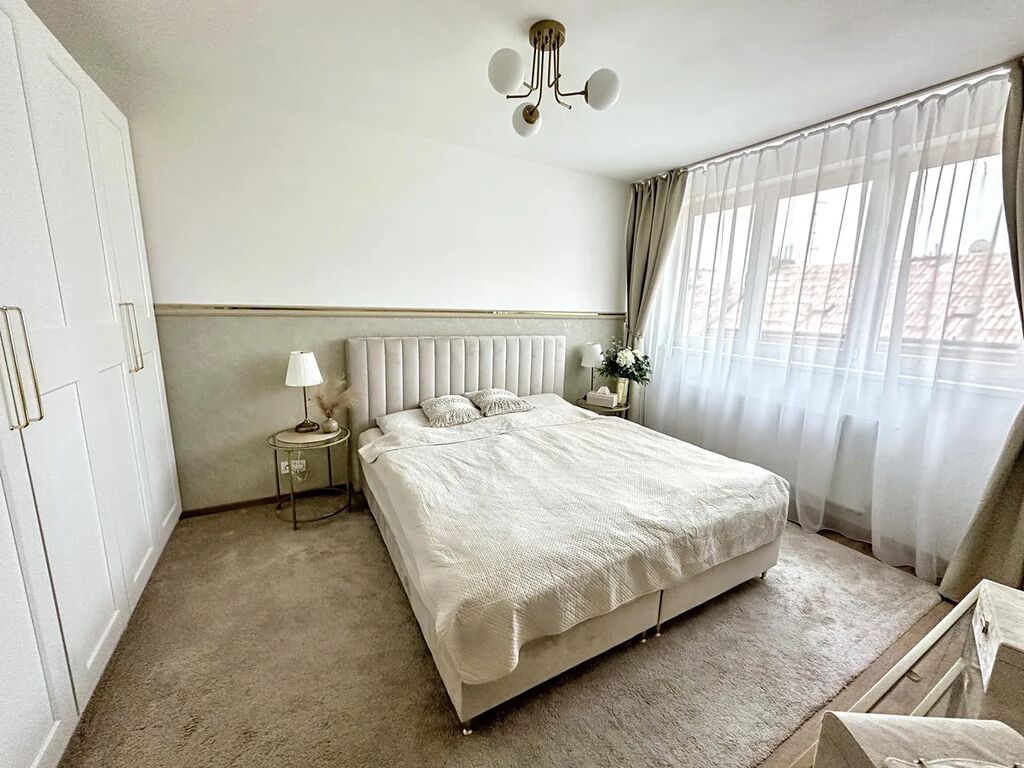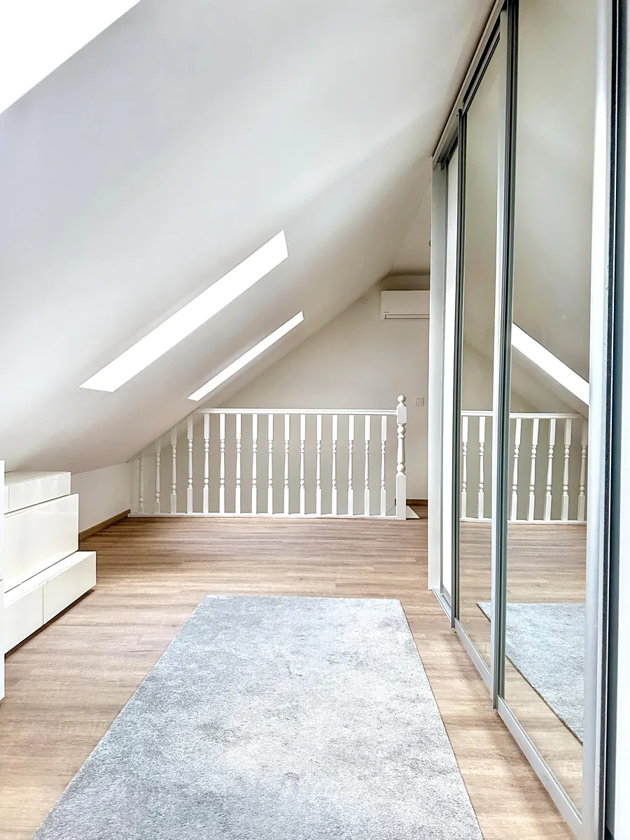 Spodní patro je řešeno jako 3+kk, skládající se z hlavního obytného prostoru s kuchyňskou linkou a dvěma ložnicemi. Kuchyňská linka s moderními spotřebiči Whirlpool byla dělaná na míru a ostrůvek z imitace kamenu s varnou deskou Elica je dominantou celého prostoru. Dále zde najdeme koupelnu s vanou a vestavěným nábytkem pro pračku a sušičku a samostatnou toaletu. V horním patře se nachází samostatná ložnice pod střechou (světlá výška v nejvyšším bodě 2,35 m).