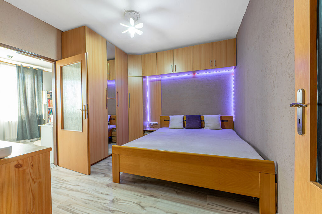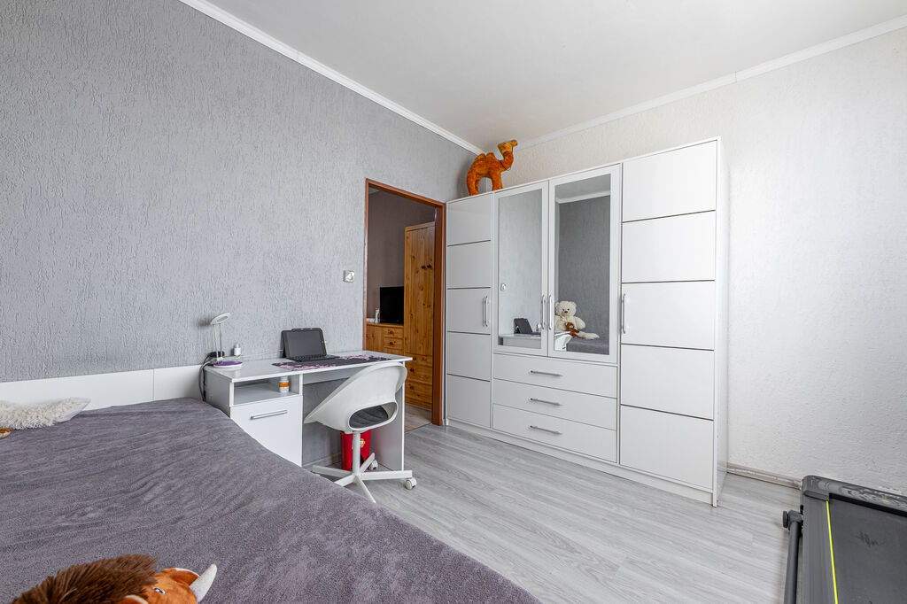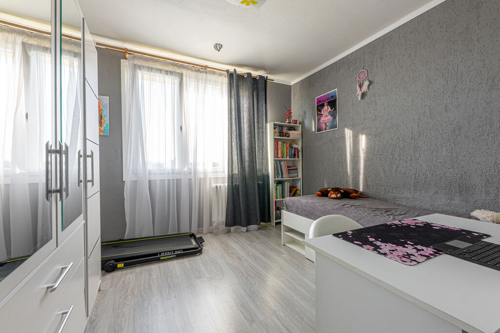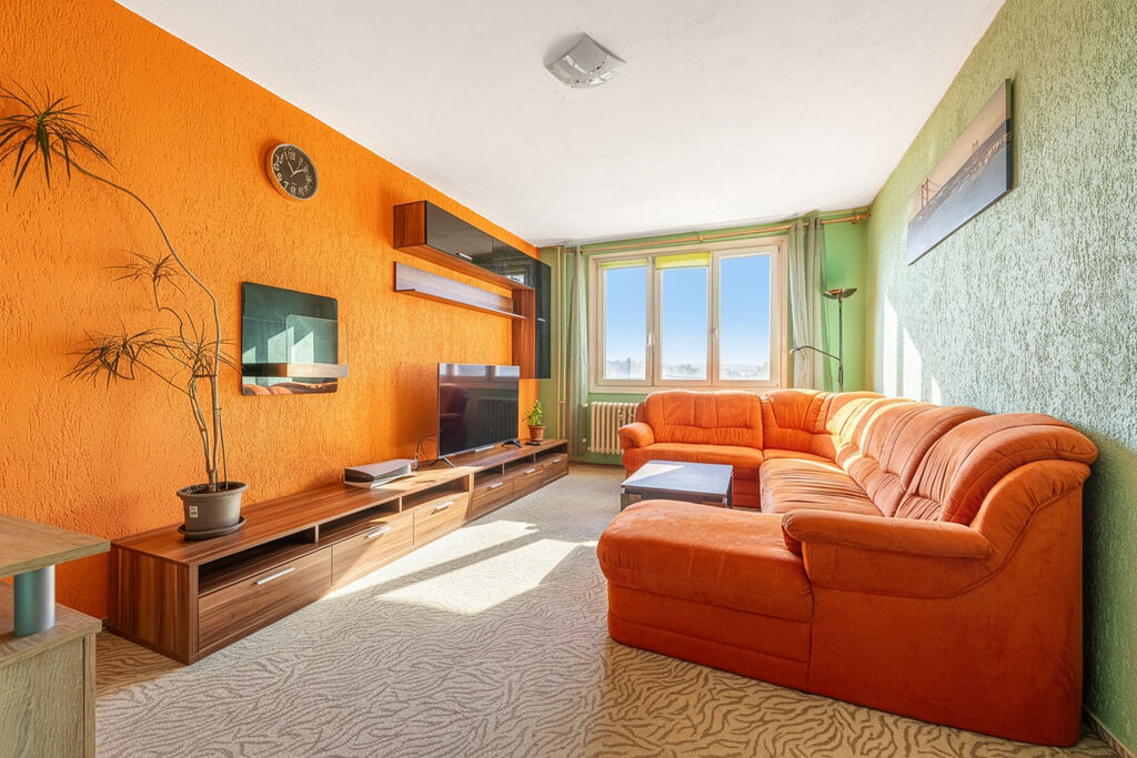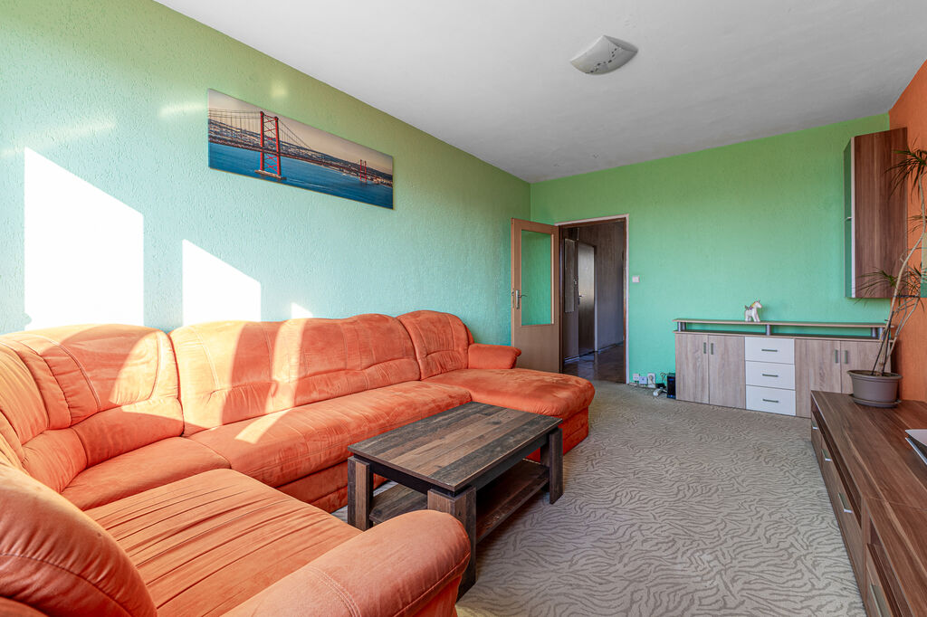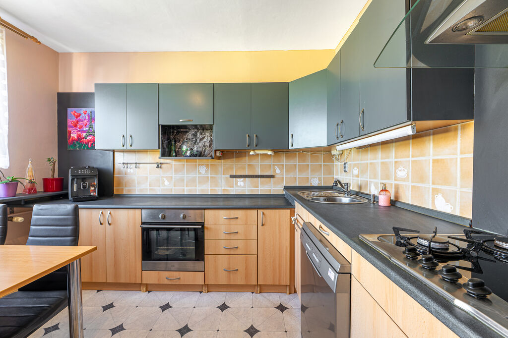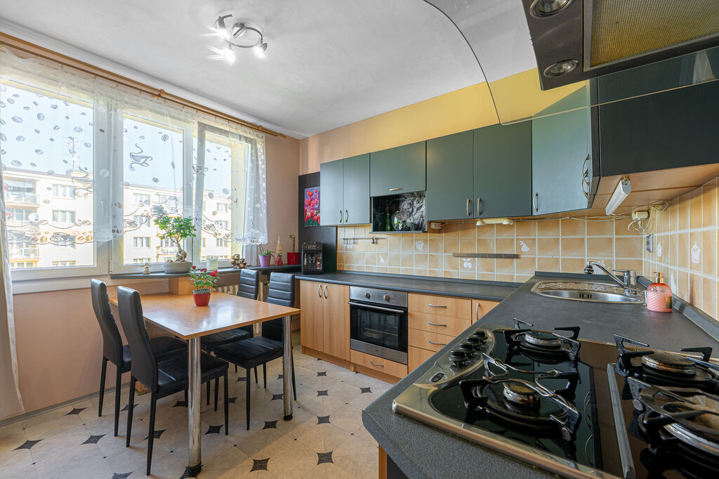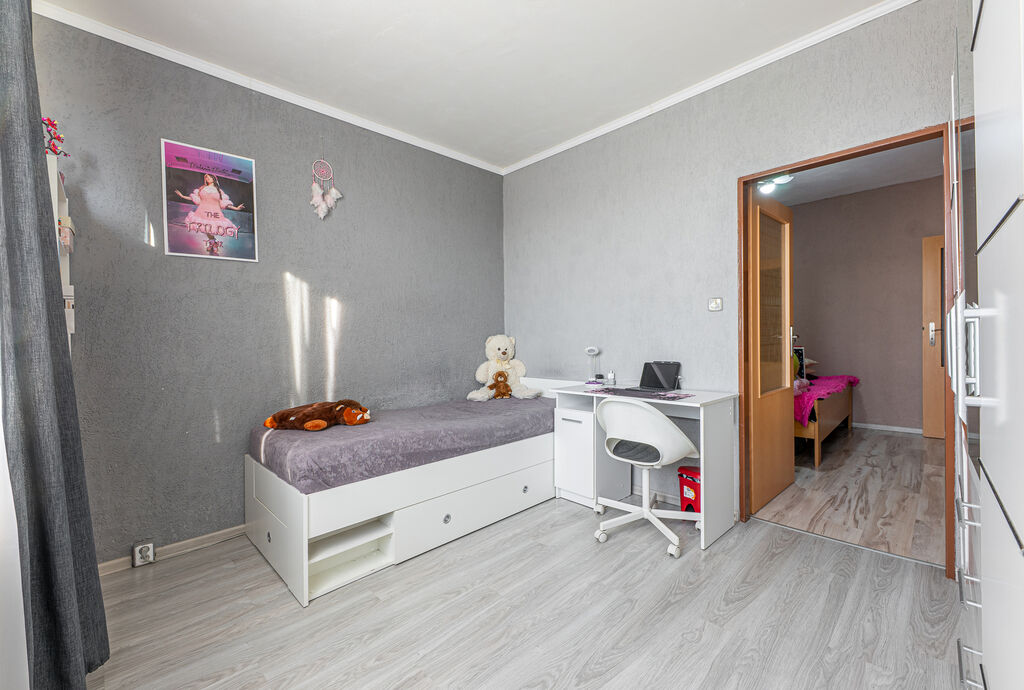 Byt se nachází v udržovaném domě a díky chytrému rozvržení je aktuálně užíván jako 3+1. Obývací pokoj o ploše 18,6 m² je orientován na jih, má nové omítky a je pokryt kobercem. Druhý pokoj (22,2 m²) je rozdělen na ložnici a dětský pokoj – obě místnosti mají plovoucí podlahu, nové omítky a dětský pokoj jižní orientaci, která zajišťuje dostatek denního světla. Kuchyně s oknem orientovaným na sever je vybavena moderní linkou v kombinaci šedé a světlého dřeva, vestavěnou troubou, myčkou a plynovou varnou deskou. Koupelna disponuje velkou rohovou vanou, umyvadlem se zrcadlem a toaletou. Plastová okna zajišťují výborné tepelně-izolační vlastnosti a komfort bydlení.