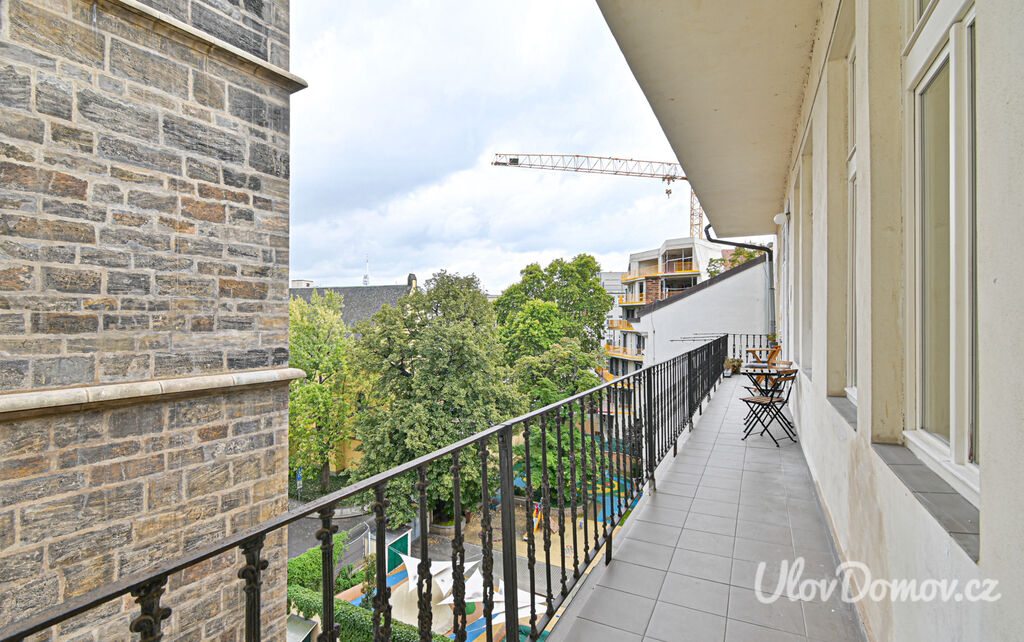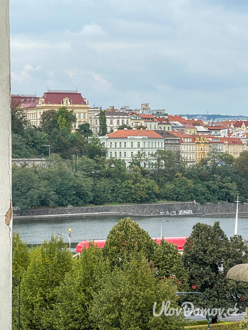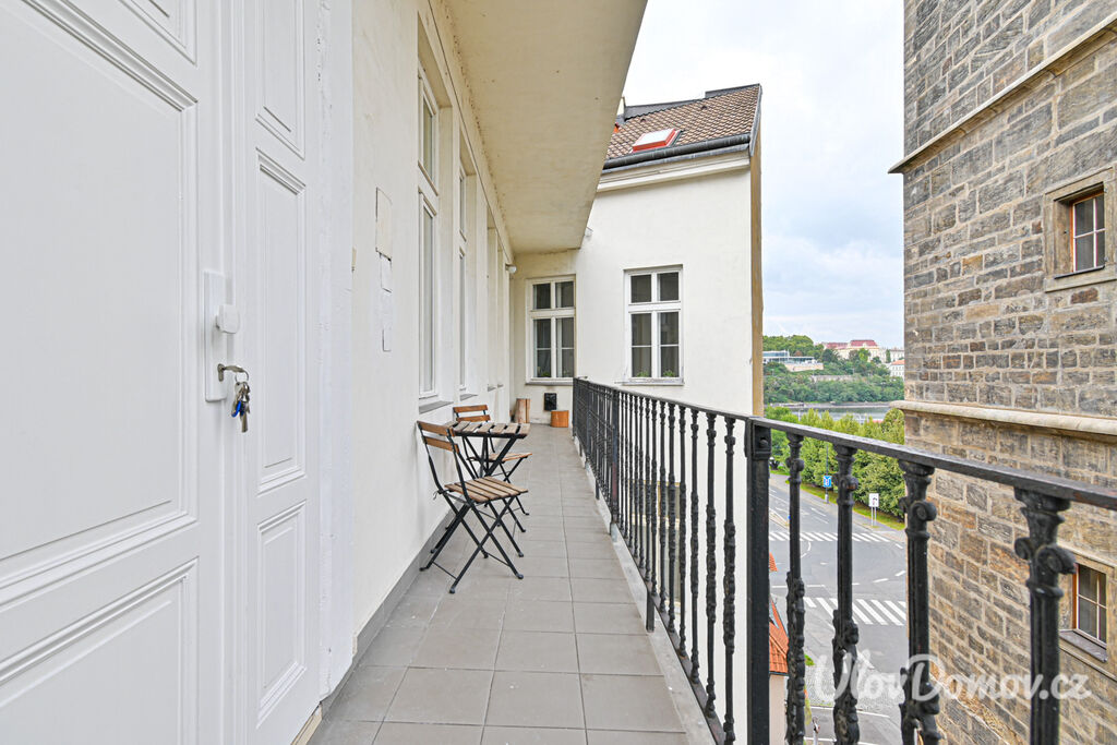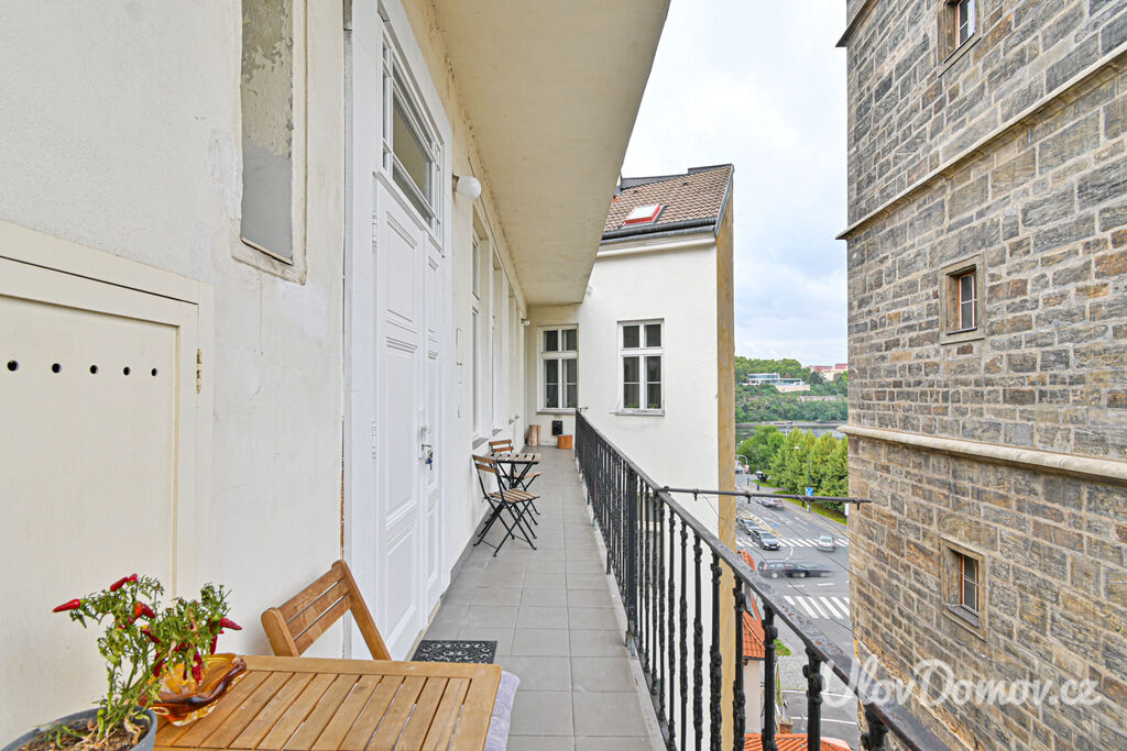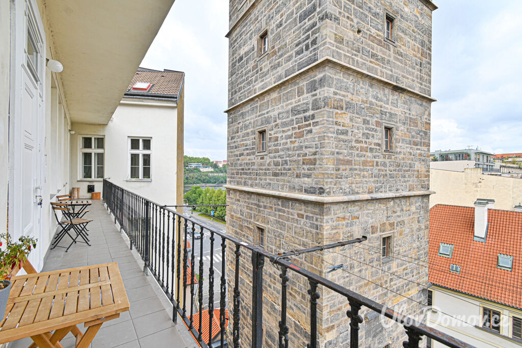 Vstup do bytu vede z historické pavlače s krásným výhledem na vodárenskou věž a řeku Vltavu.