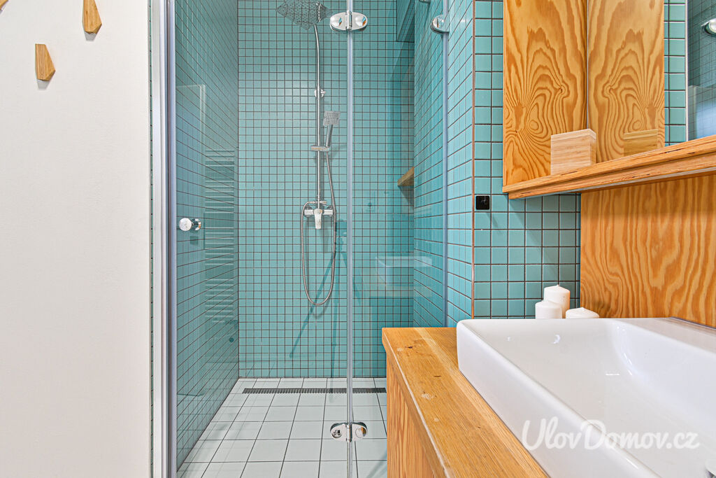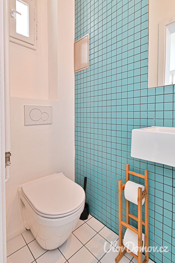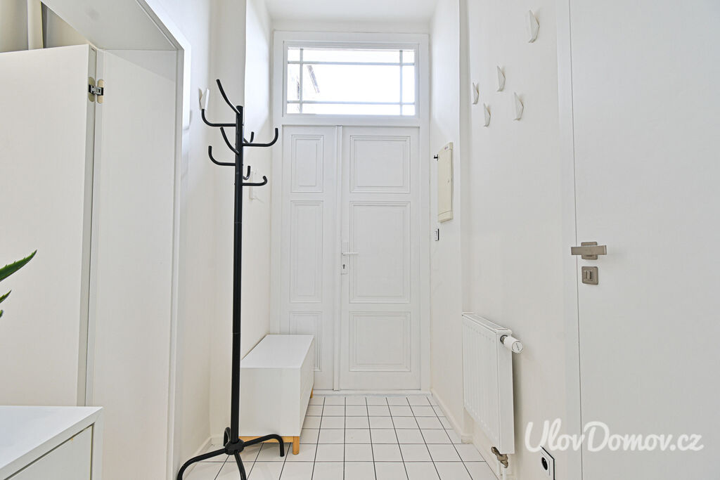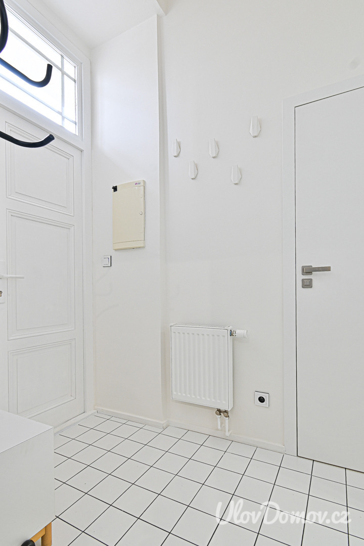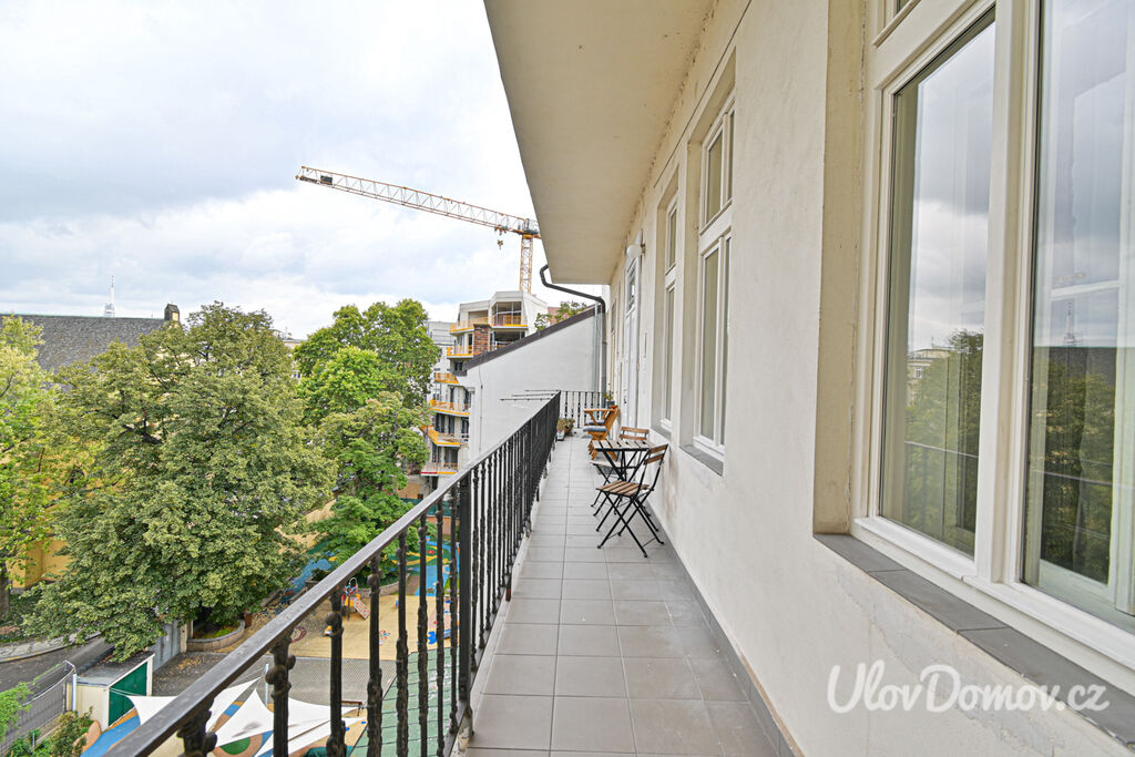 Vstup do bytu vede z historické pavlače s krásným výhledem na vodárenskou věž a řeku Vltavu.