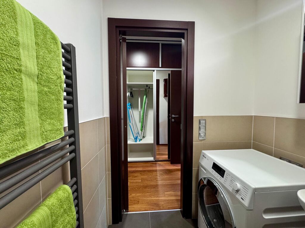 Byt je zařízen do posledního detailu. Obytný prostor je prosvětlen velkoformátovými okny s výhledem do zeleně a nabízí kombinaci odpočinkové, pracovní a jídelní části. Kuchyňská linka na míru je vybavena vestavnými spotřebiči troubou, varnou deskou, myčkou, mikrovlnnou troubou a lednicí s mrazákem. K dispozici je pohodlné posezení, pracovní stůl, ložnicová část s manželskou postelí a dostatek úložného prostoru. Koupelna je vybavena vanou a pračkou Miele, samostatné WC a prostorná vstupní hala s vestavnou skříní doplňují komfortní dispozici.