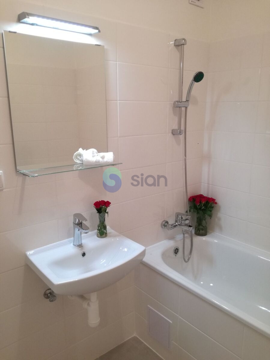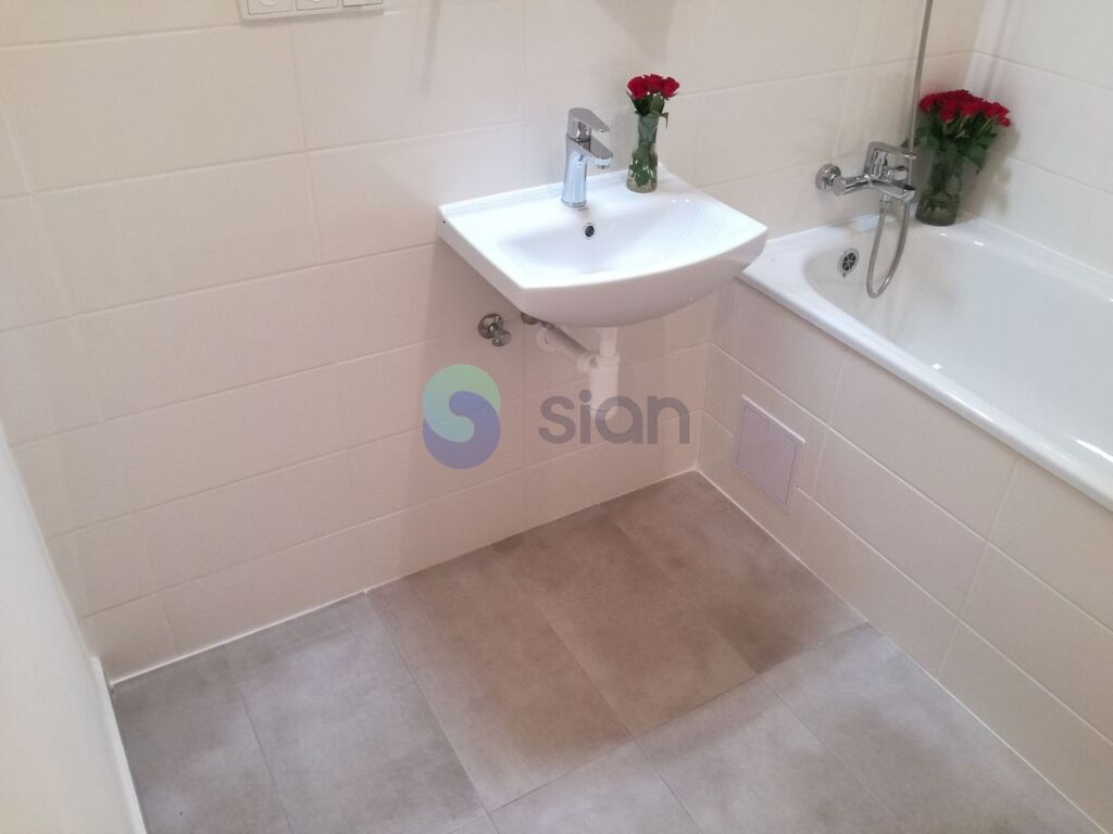 Prostorná koupelna disponuje vanou a umyvadlem a s možností připojení pračky, toaleta je odděleně.