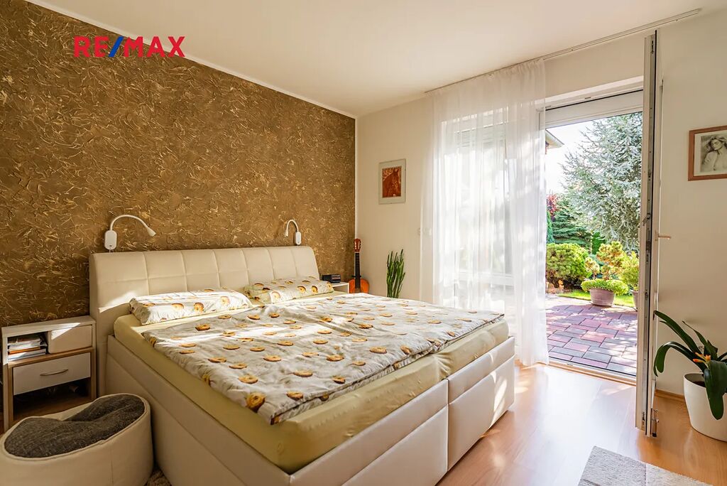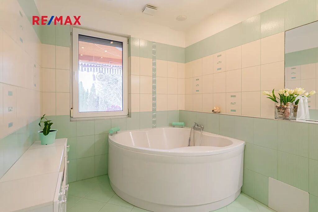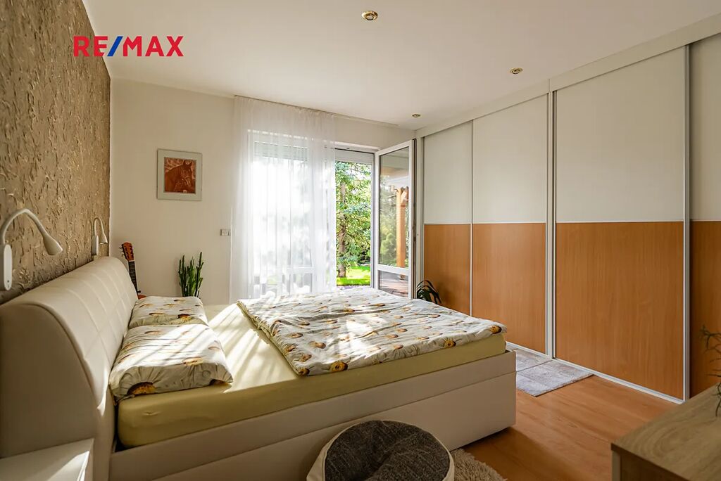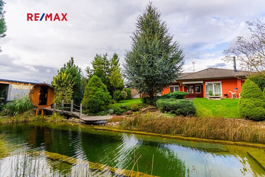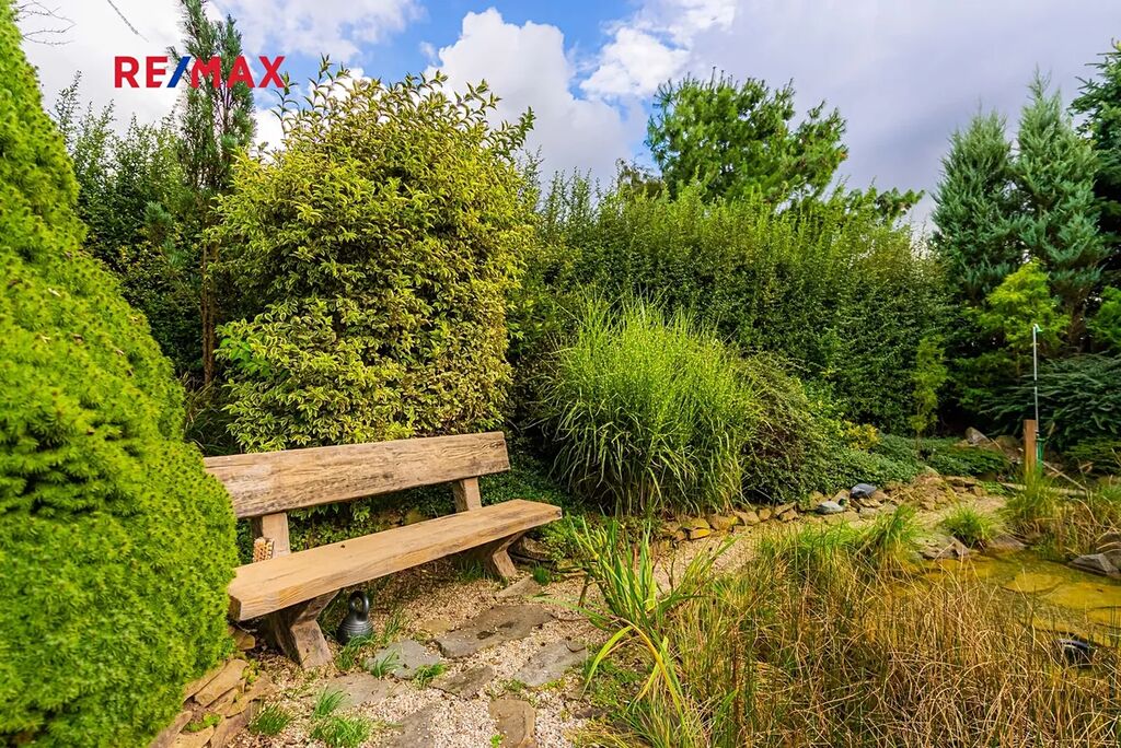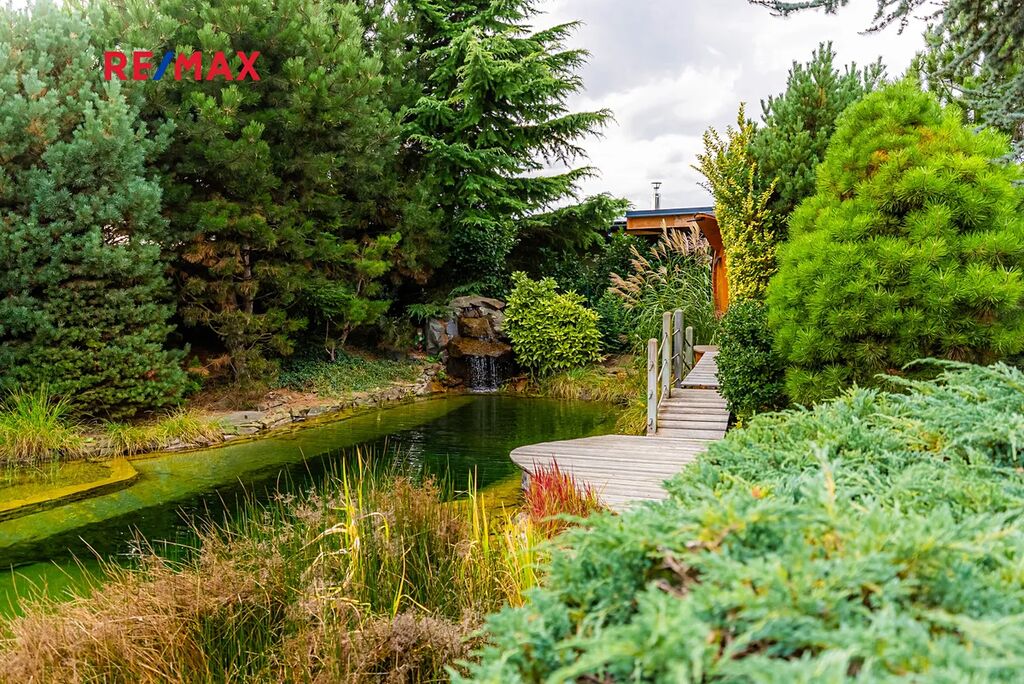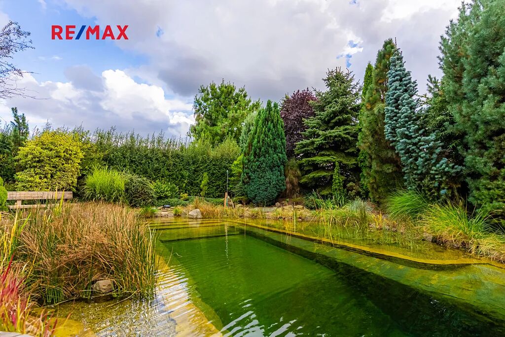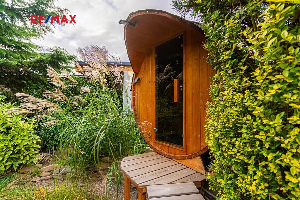 Největší předností je zahrada orientovaná na jihozápad, kde si vychutnáte slunce od odpoledne až do večera. Dominantou pozemku je velké koupací jezírko – biotop (cca 17 × 4 m), které slouží nejen k osvěžení, ale i k plavání. Atmosféru doplňuje finská sauna, venkovní gril a vzrostlé stromy – cedr, borovice, smrk i jedle. Na zahradě je automatické zavlažování a vlastní studna.