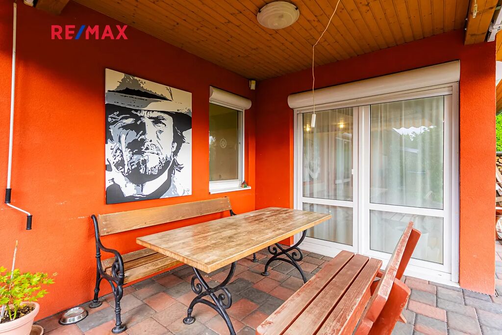 K zázemí patří dvě velké garáže (32 m², 27m²) s dílnou, dřevárnou a WC a vydlážděné plochy kolem domu s další možností parkování.