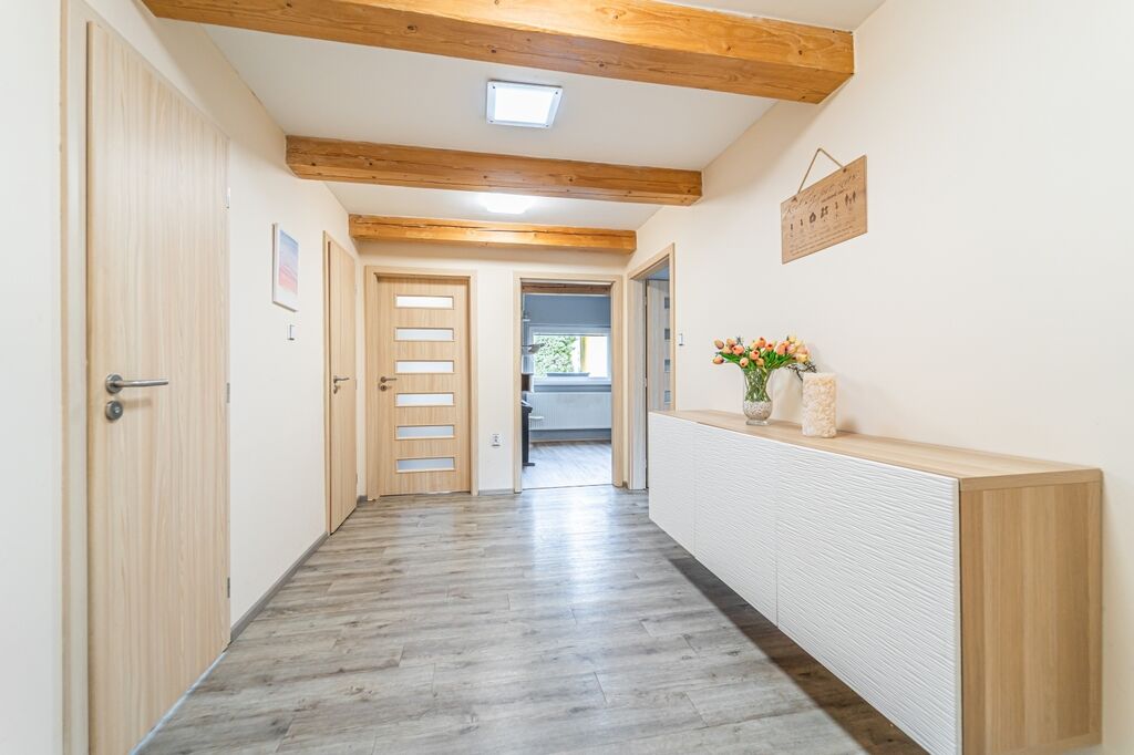 Koupelna nabízí sprchový kout i vanu, velké úložné skříňky a pračku se sušičkou lze uspořádat nad sebe; toaleta je samostatná. V obytných místnostech je kvalitní vinylová podlaha. V kuchyni, v koupelně, na WC, v zádveří a v technické místnosti je keramická dlažba. Ze šatny je přístup na půdu využívanou jako praktické úložiště.
