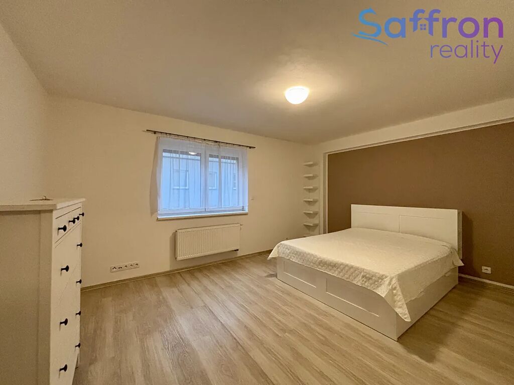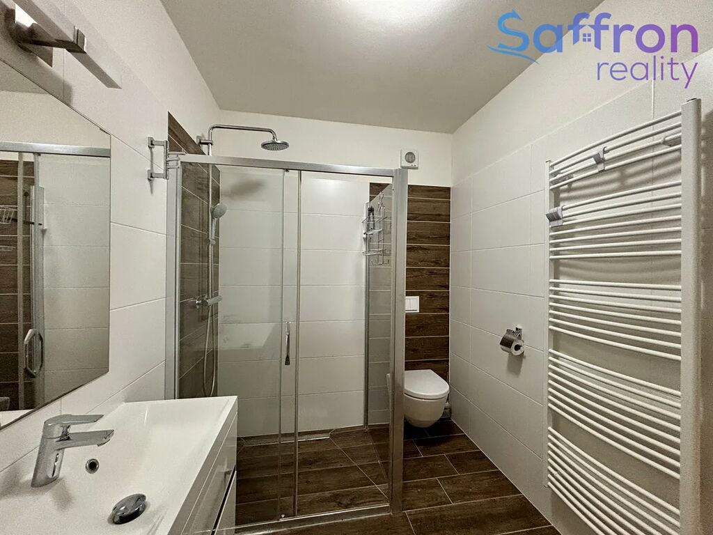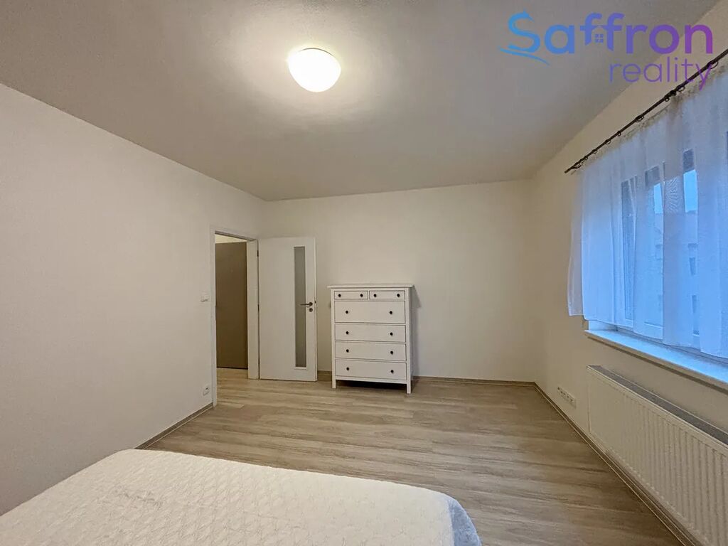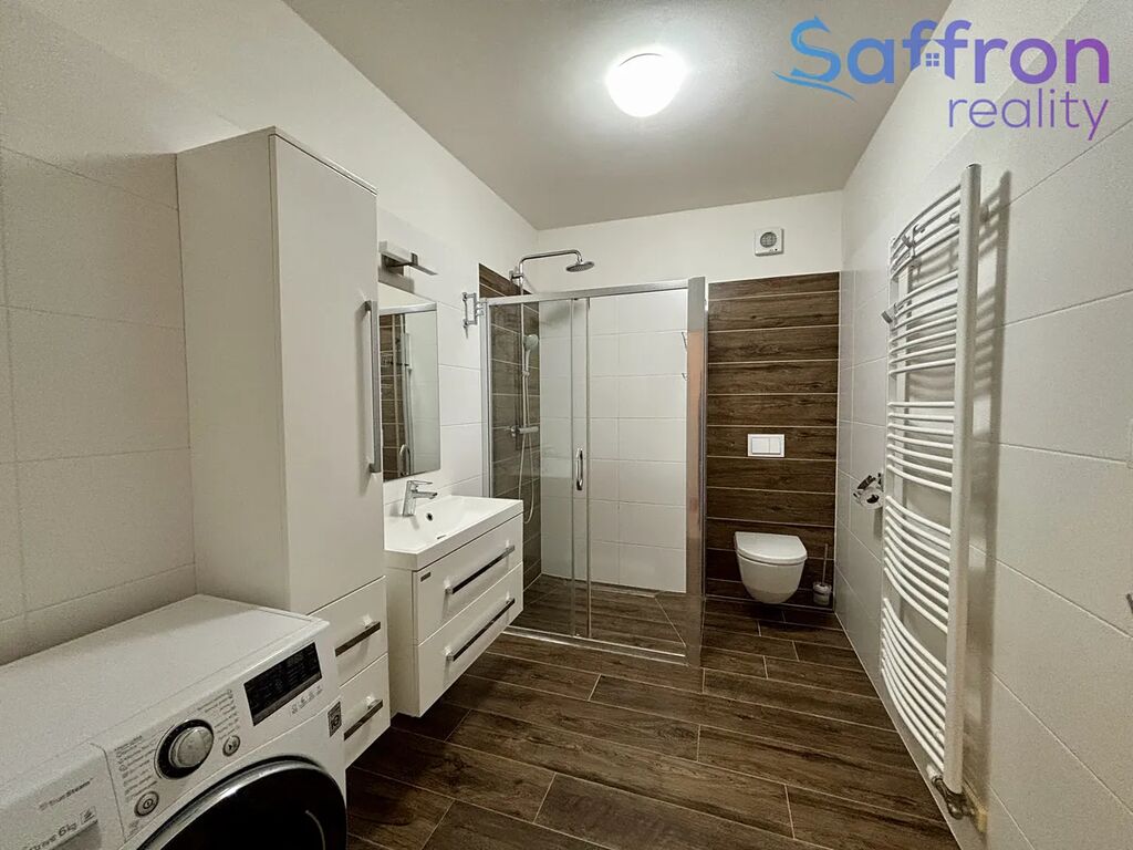 Ložnice je zařízena v příjemném stylu s manželskou postelí a komodou. O soukromí a klid se starají venkovní žaluzie, které zároveň pomáhají udržet v bytě příjemnou teplotu po celý rok. Koupelna je řešena se sprchovým koutem, toaletou a pračkou se sušičkou.
