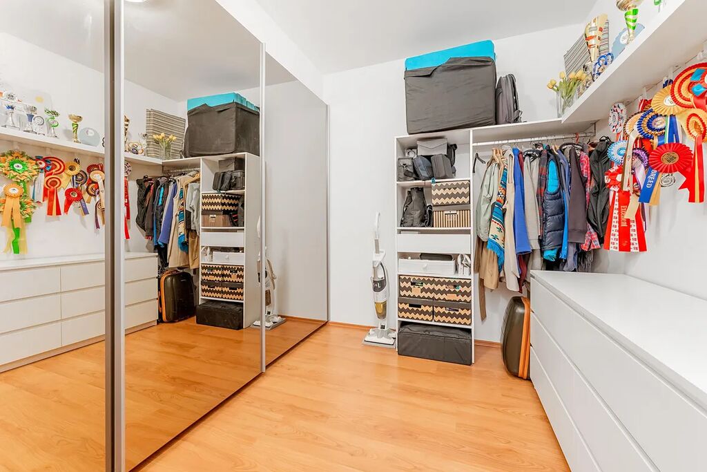 - dispozice bytu umožňuje ze současné šatny vytvořit další pokoj (podívejte se na upravený půdorys, jak by tato změna mohla vypadat).