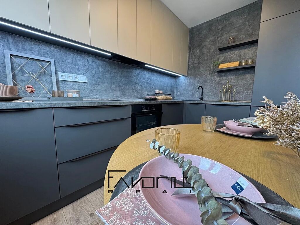 • kuchyňská linka na míru včetně vestavných spotřebičů (lednice, myčka, digestoř, elektrická trouba a varná deska)