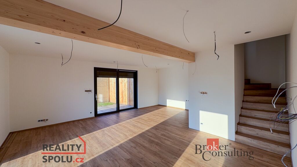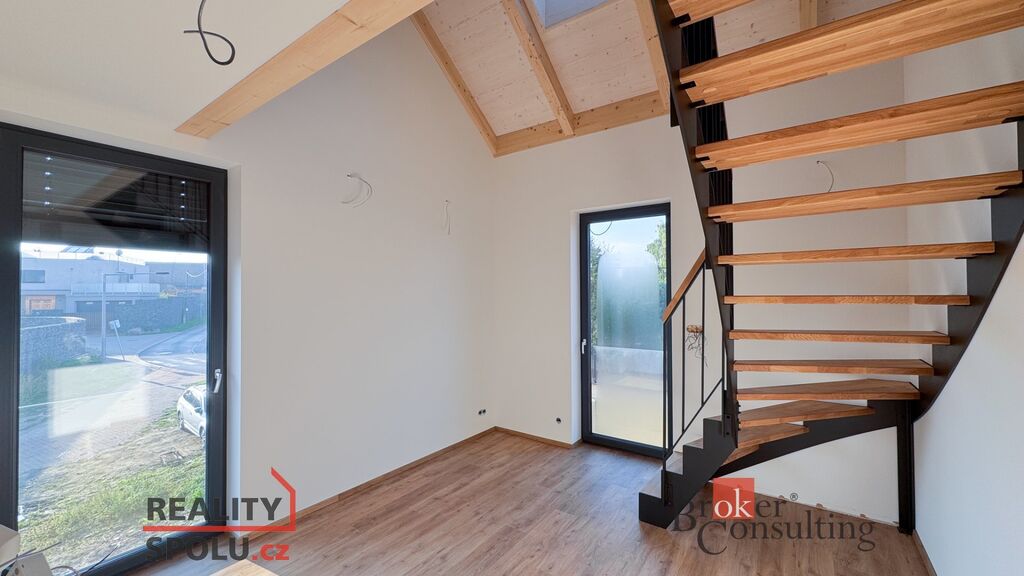 Interiér propojuje prostornost, světlo a moderní design. V přízemí se nachází vstupní hala, koupelna a velkorysý obývací pokoj s jídelnou a kuchyní, ze kterého je přímý vstup na terasu a do zahrady – ideální místo pro odpočinek a setkávání s blízkými.