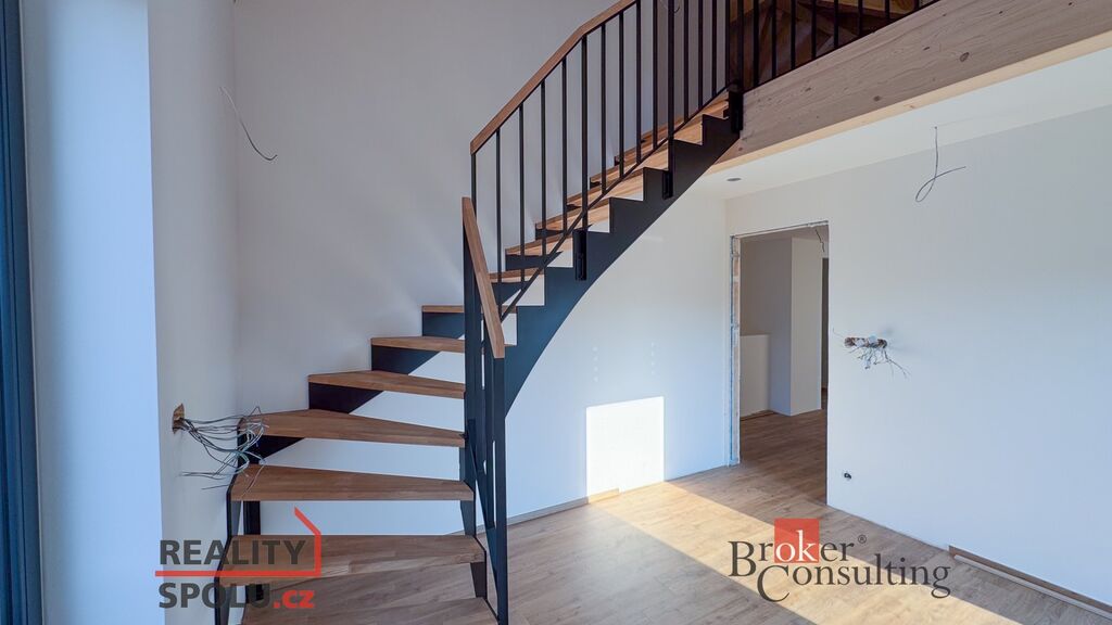 V patře jsou útulné ložnice, šatna a koupelna s technickým zázemím. Vybrané pokoje jsou řešeny jako mezonetové prostory, které dodávají interiéru vzdušnost a originální charakter.
