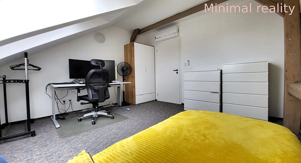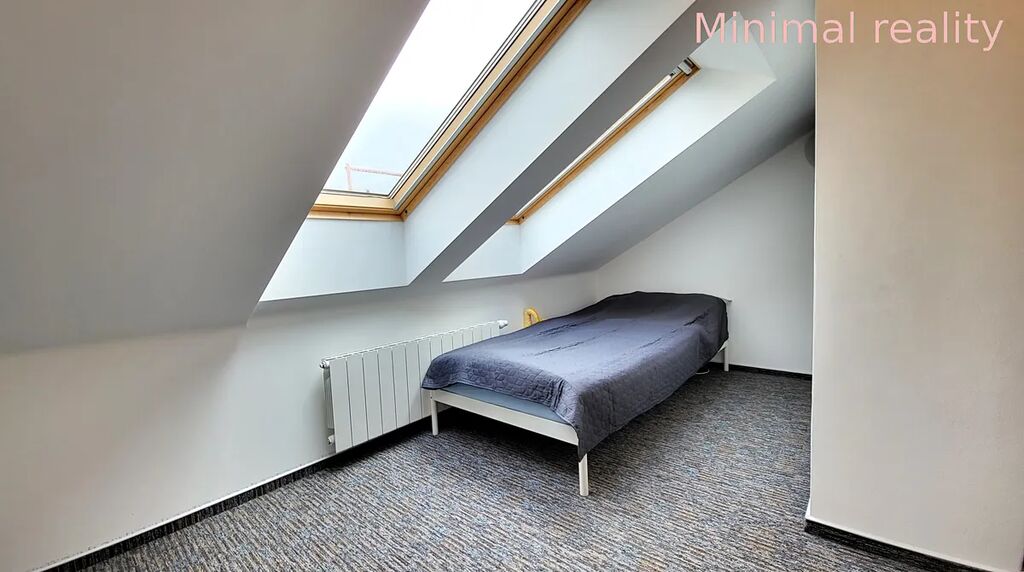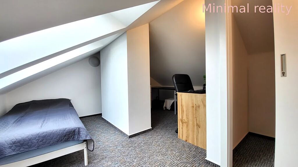 Z chodby s botníkem, věšákem a zrcadlem je vstup po dřevěném schodišti z masivu do druhého podkrovního pokoje. Pokoj je od schodiště oddělen posuvnými dveřmi a je vybaven postelí a pracovním stolem.