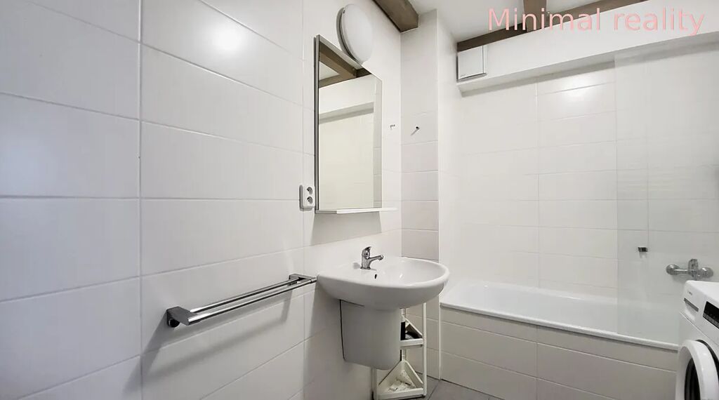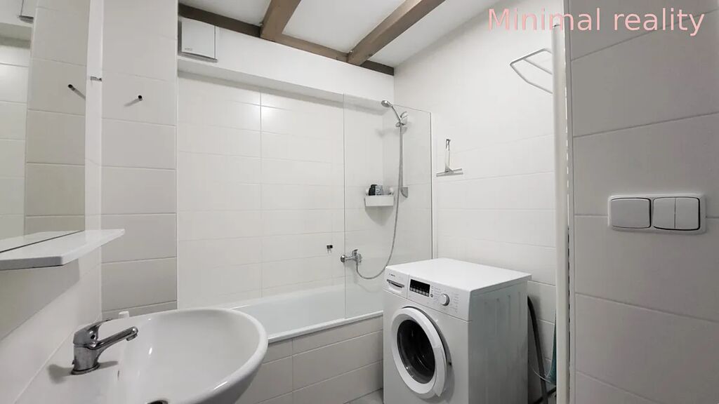 Koupelna je vybavena vanou se skleněnou zástěnou, umyvadlem, zrcadlem s osvětlením, topným žebříkem, pračkou značky BOSH a ventilátorem. Toaleta je samostatná.