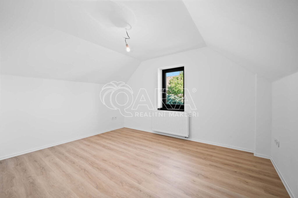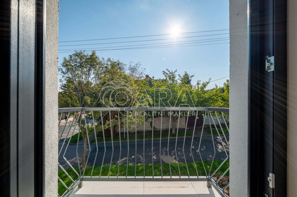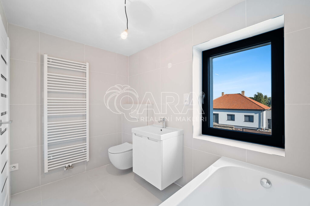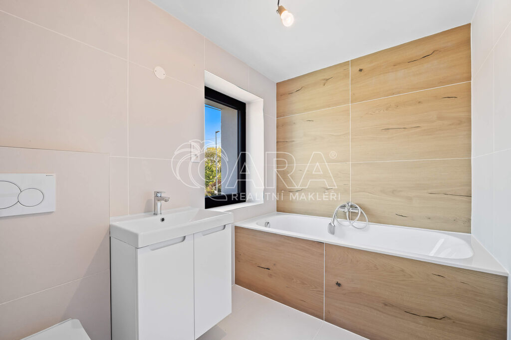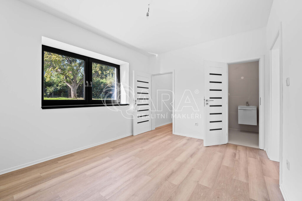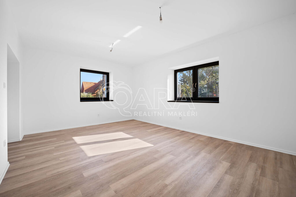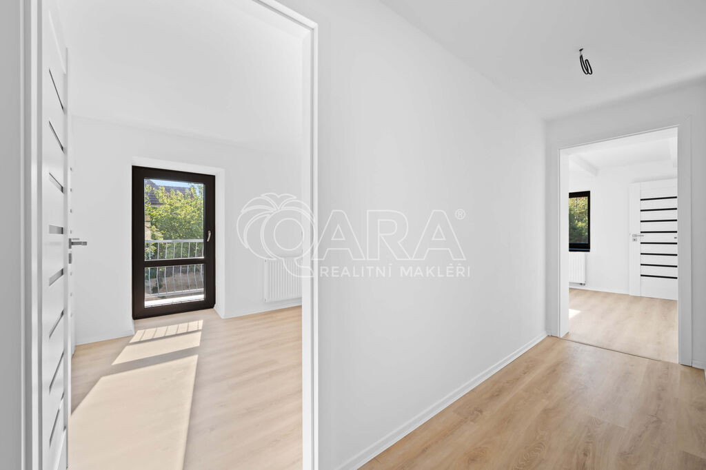 V patře jsou tři samostatné pokoje, z nichž dva mají vlastní šatnu a jeden přístup na balkon a dále samostatná koupelna s vanou a WC.