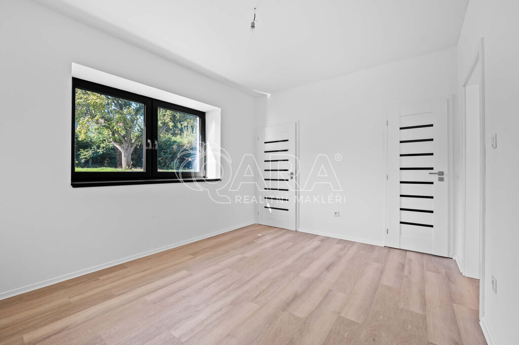 Na podlahách byla položena vinylová podlaha v kombinaci s dlažbou a byly dodány veškeré zařizovací předměty do koupelen a na WC, dále pak dveře včetně obložek. Jinak je dům nevybaven.
