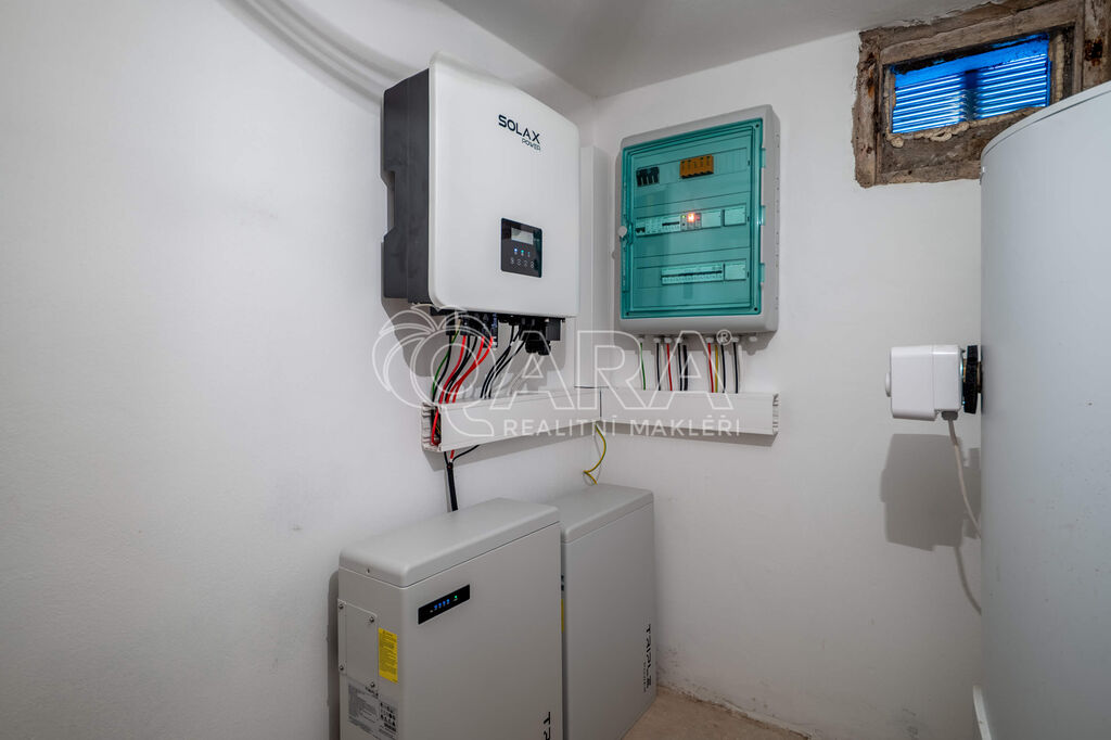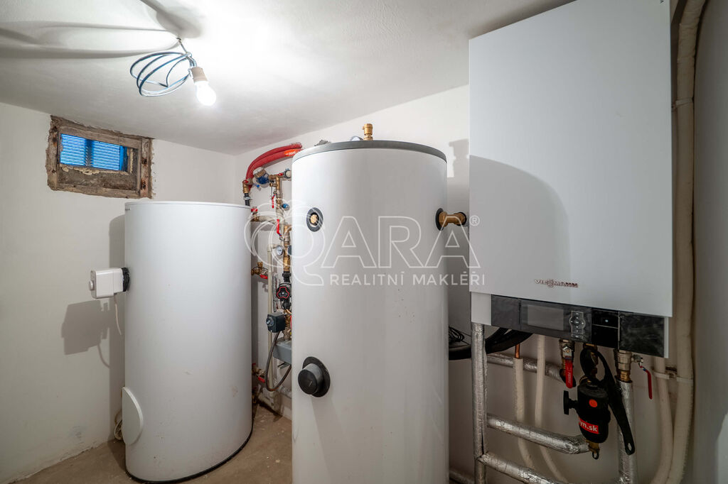 Veškeré technologické zázemí je instalováno ve sklepě. K domu také náleží samostatná garáž.