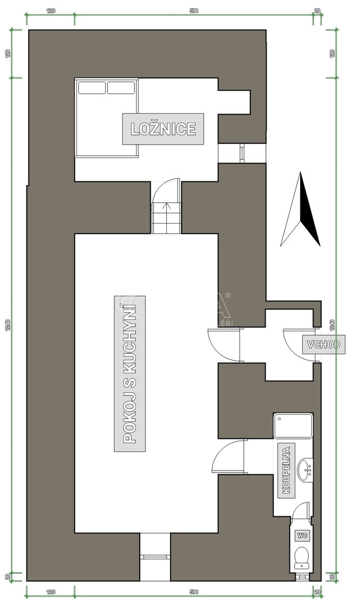 Byt se nachází v přízemí bytového domu s přímým vstupem na uzavřený dvorek. Obývací pokoj s kuchyňským koutem nabízí dostatek prostoru. Na něj navazuje koupelna se sprchovým koutem a toaletou. Po několika schůdkách přejdete do samostatné ložnice.