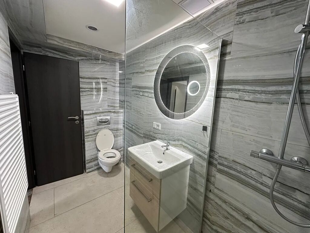 V bytě se nachází vstupní chodba, kuchyň, obývací pokoj, ložnice, tech. místnost, koupelna se sprchovým koutem a WC.