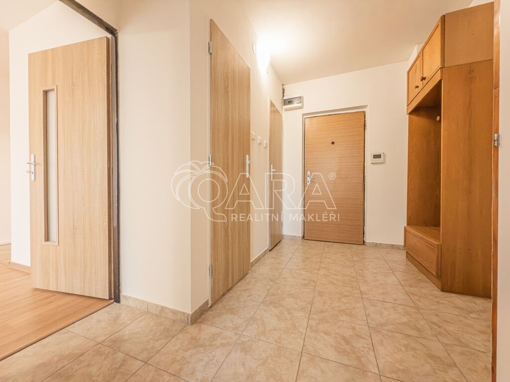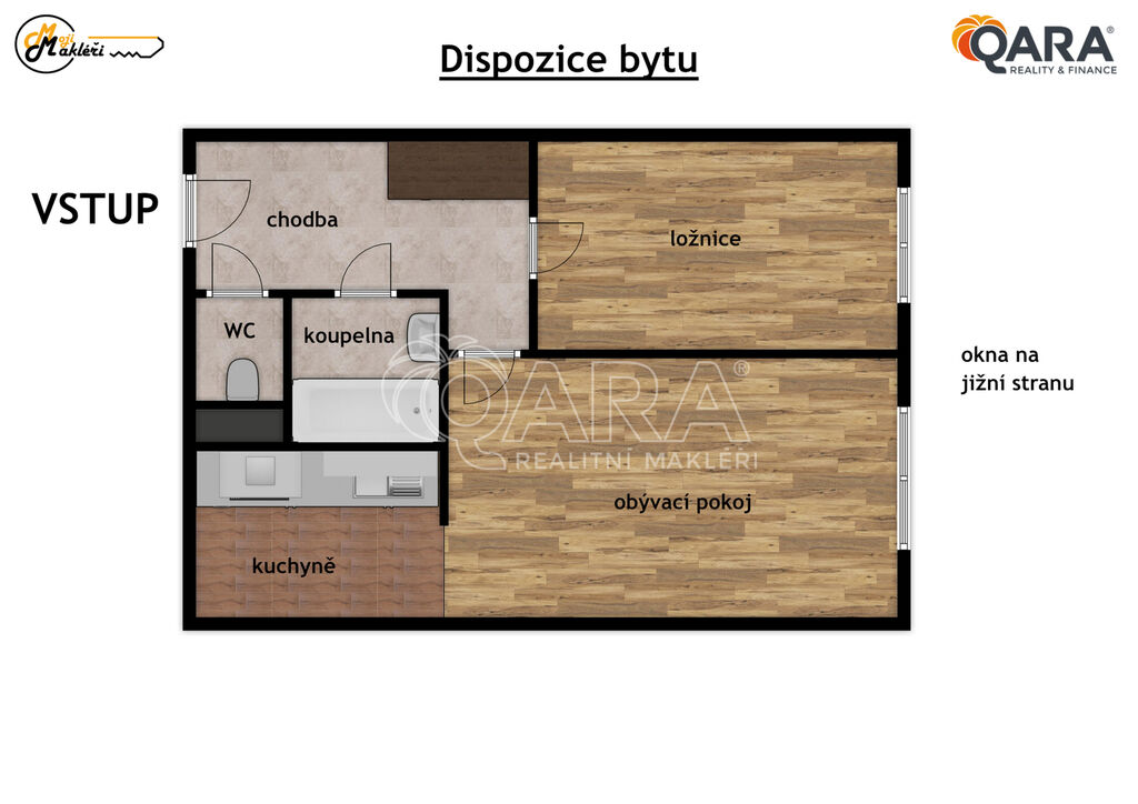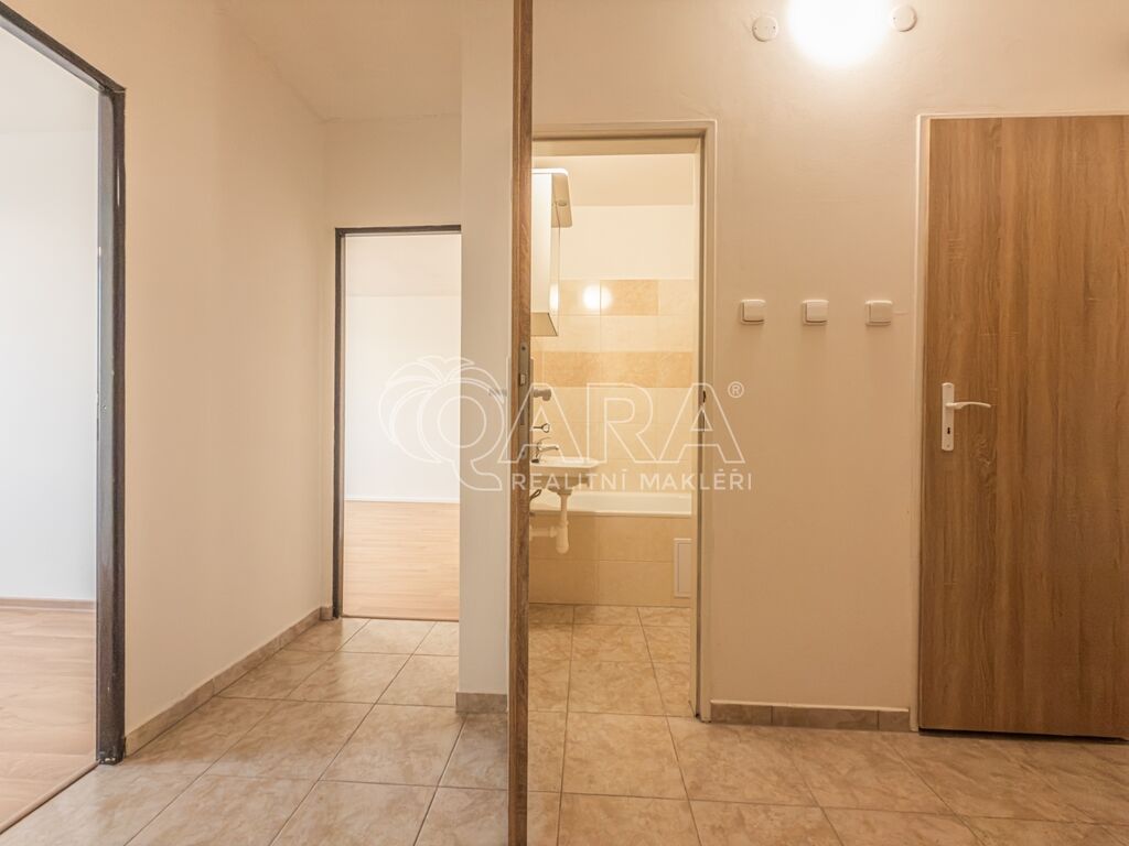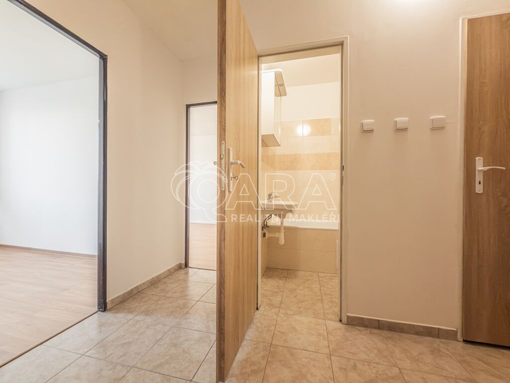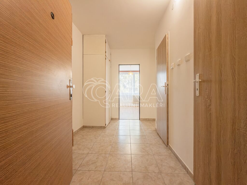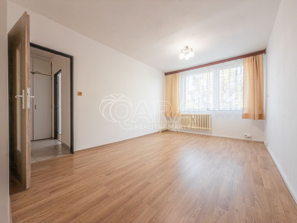 Byt se nachází v přízemí čtyřpodlažního domu bez výtahu. Díky tomu, že pod ním jsou garáže jsou okna situována výše nad úrovní terénu, nejde tedy o klasické přízemí a byt je tak dobře chráněný a zároveň světlý. Za vstupními dveřmi je chodba s prostornou vestavěnou skříní. Na chodbě se nachází také samostatná toaleta a koupelna s vanou a přípojkou na pračku. Dalšími místnostmi jsou ložnice a obývací pokoj propojený s kuchyňským koutem, přičemž všechny místnosti jsou přístupné přímo z chodby. V obytných pokojích je plovoucí podlaha, v chodbě a kuchyňském koutě pak dlažba.