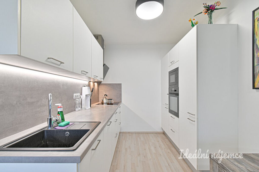 Byt se nabízí plně vybavený dle fotografií. Kuchyně disponuje lednicí, myčkou, elektrickou troubou, varnou deskou, mikrovlnnou troubou a digestoří. V obývacím pokoji je konferenční stolek, gauč a televize. V předsíni je velká vestavěná skříň. V koupelně je vana, umyvadlo a pračka se sušičkou. V ložnici je postel a šatní skříň. Toaleta je umístěna samostatně.