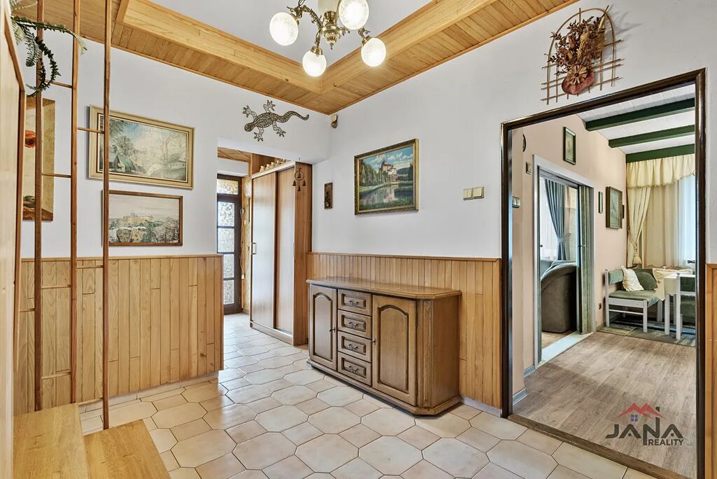 Na dům přímo navazuje stodola, kde je garáž, kryté stání bez vrat a zbylá část původní stodoly – ideální pro dílnu nebo skladování.