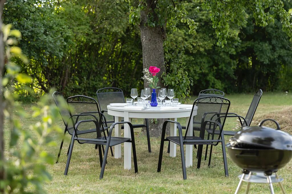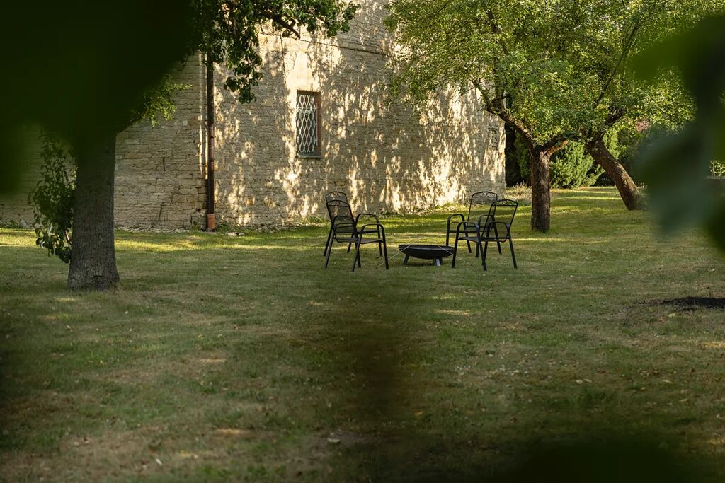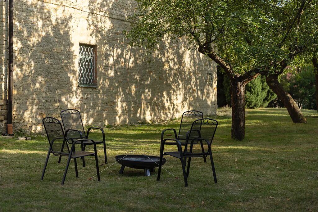 Dvůr navazuje na velkorysou, poklidnou zahradu na níž naleznete krásnou, nově vybudovanou pergolu s posezením a krbem. Současný majitel má historicky uzavřenu pachtovní smlouvu, díky které je za menší poplatek k dispozici další prostorná zahrada (celkem navíc přes 5000 m2), která je majiteli plně k dispozici. Díky tomuto spojení nabízí zahrada opravdu neuvěřitelný, soukromý prostor kolem domu, který si zamilujete. Na zahradě jsou vzrostlé stromy, které v parném létu poskytují příjmy stín.