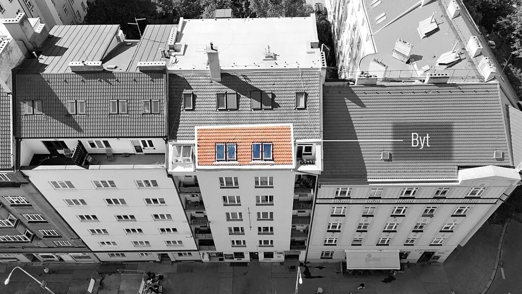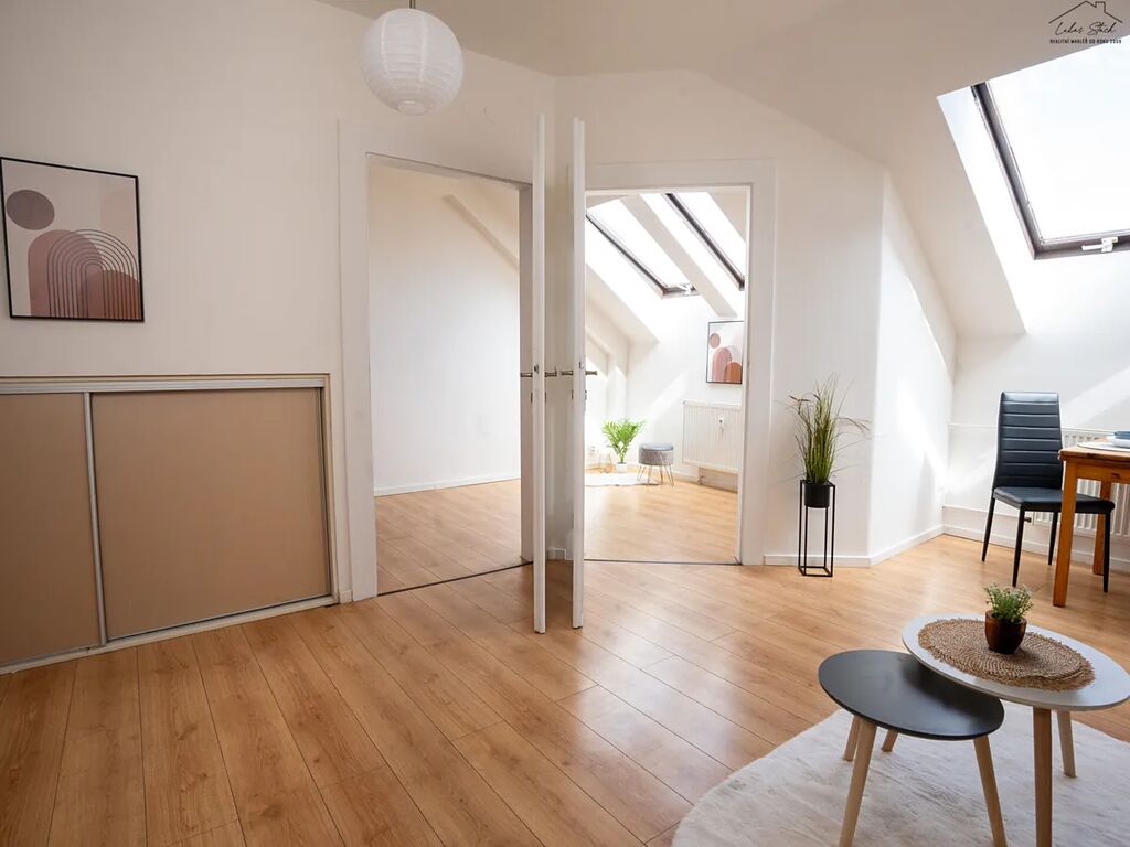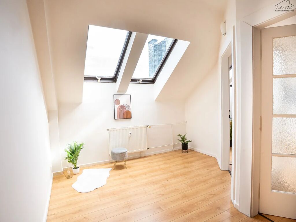 Samotný byt působí díky otevřené dispozici a čtyřem střešním oknům světlým a vzdušným dojmem. Výhodou je nečekaně velkorysé množství úložných prostor – kromě vestavěných skříní a prostoru pod spacím patrem zde najdete i dostatečně velkou komoru, kam pohodlně uložíte sezónní věci, kufry, krabice nebo třeba jízdní kolo. Praktickým řešením je i samostatná koupelna a toaleta. K bytu náleží také lodžie, přístupná ze společné chodby, sdílená jen se dvěma dalšími byty na patře.