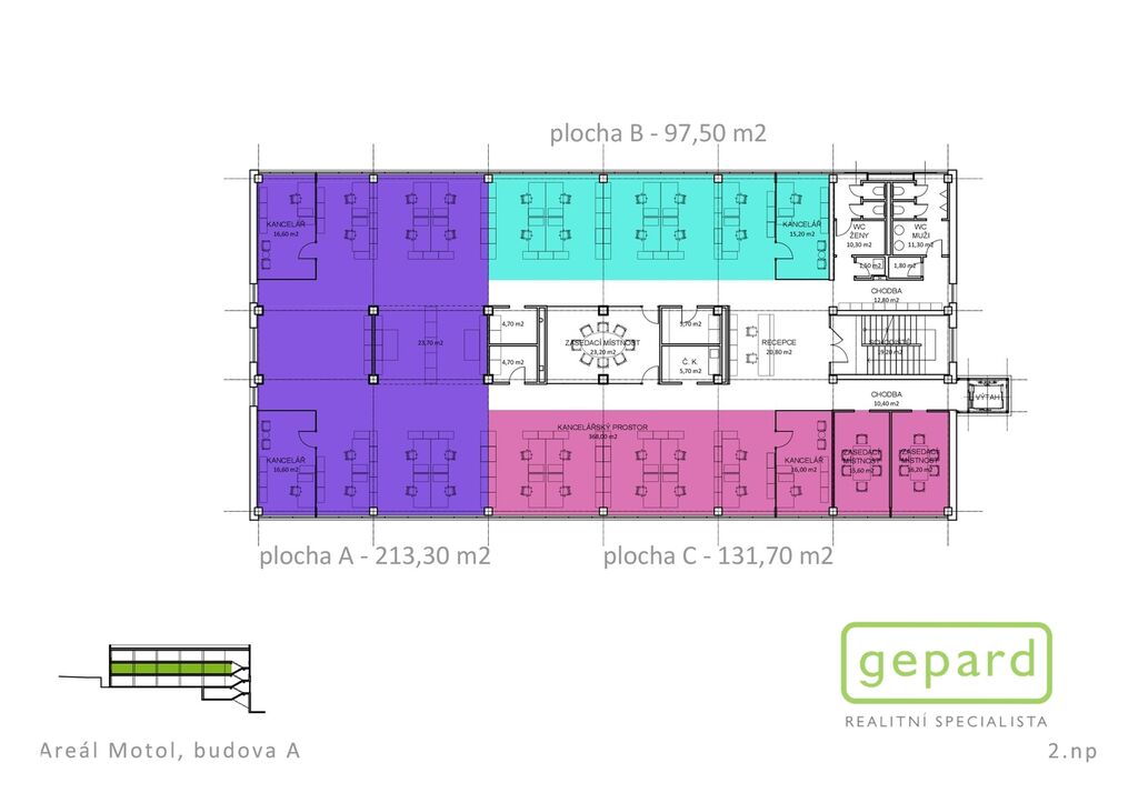 Nabízený prostor o rozloze 131,70 m2 zaujímá část 2. nadzemního podlaží jedné z hlavních budov komplexu. Dispozice je uvedena v přiloženém půdorysu (plocha C). Vybavení je znázorněno na fotografiích. Nájemce může využívat společné prostory: zasedací místnost (23,20 m2), kuchyňku (5,70 m2), toalety (34,90 m2). Poplatek za využívání společných prostor činí 8.655,- Kč. Dále je možné pronajmout sklady (2x4,3 m2 a 1x5,70 m2) za stejnou cenu na m2 jako kanceláře a parkovací stání za poplatek 2.000,- Kč měsíčně za osobní vozidlo. Recepce je v provozu 24 hodin. V komplexu je možné využít konferenční sál (kapacita až 150 míst) a služby restaurace na snídaně a obědy (kapacita až 114 míst) a také služby hotelu.