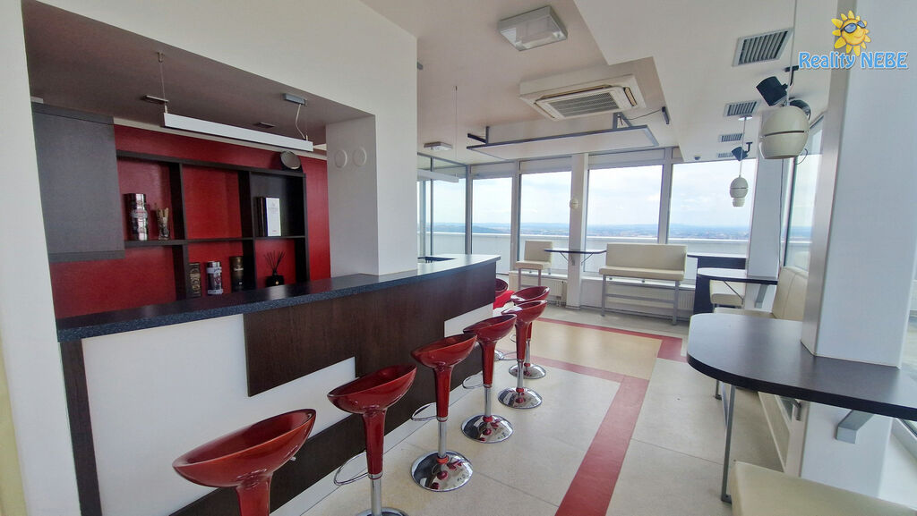 V 15. NP se nachází exkluzivní zařízený byt 2+kk (184 m2) – obývací pokoj s jídelnou, barem a kuchyňskou linkou (96 m2), ložnice s pracovnou a předsíní (48 m2 – prosklený sprchový kout, kancelářské zázemí), lodžie (14 m2), předsíň se šatnou (17 m2), koupelna s vířivou vanou (7 m2), WC (2 m2).