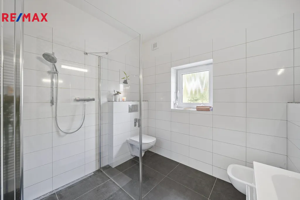 V patře domu jsou dva samostatné a prostorné pokoje, hlavní ložnice, kde každý pokoj má vlastní šatnu. Šatnám dodává světlo střešní okna. K dispozici je také samostatné WC a luxusní koupelna s vanou, sprchovým koutem, dvojumyvadlem a profesionální finskou saunou. Součástí domu je i půdní prostor přístupný skládacími schody, využitelný jako úložný.