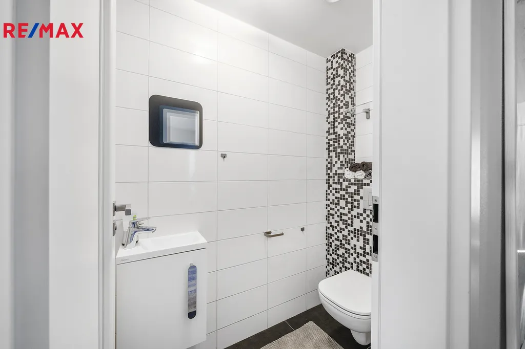 Garsonka má samostatný vstup z přední části domu. Dispozice zahrnuje předsíň, koupelnu (sprcha, WC, umyvadlo, přípojka na pračku) a obytný pokoj s kuchyňským koutem. Také z garsonky je vstup na terasu. Lze ji využít pro své rodiče, k pronájmu, pro hosty či jako kancelář.