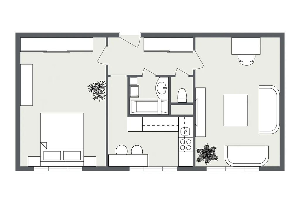 Pokoje jsou neprůchozí, přístupné z předsíně, ve které je umístěna na míru zhotovená stěna s dostatkem úložných prostorů.