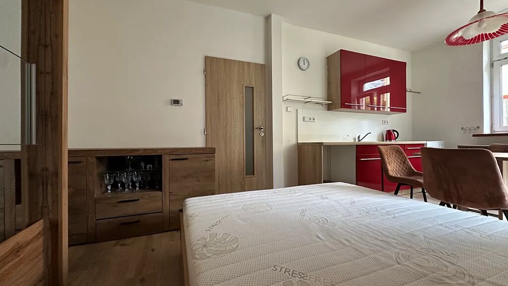 Pronájem bytu 1+kk v centru Luhačovic s vlastní zahradou s přímým přístupem z pokoje. Nachází se v 1. patře prvorepublikové vily. Byt sestává ze vstupní choby, pokoje s kuchyňskou linkou, sporákem, troubou, lednicí, dále je k dispozici stůl s židlemi, manželská postel, skříň, komoda, koupelna vanou a WC. Vytápění infrapanely + krbová kamna. Výměra 30 m2, slunná zahrada s ovocnými stromy o výměře 212 m2. Výborná poloha! K nastěhování od 1. 11. 2025.