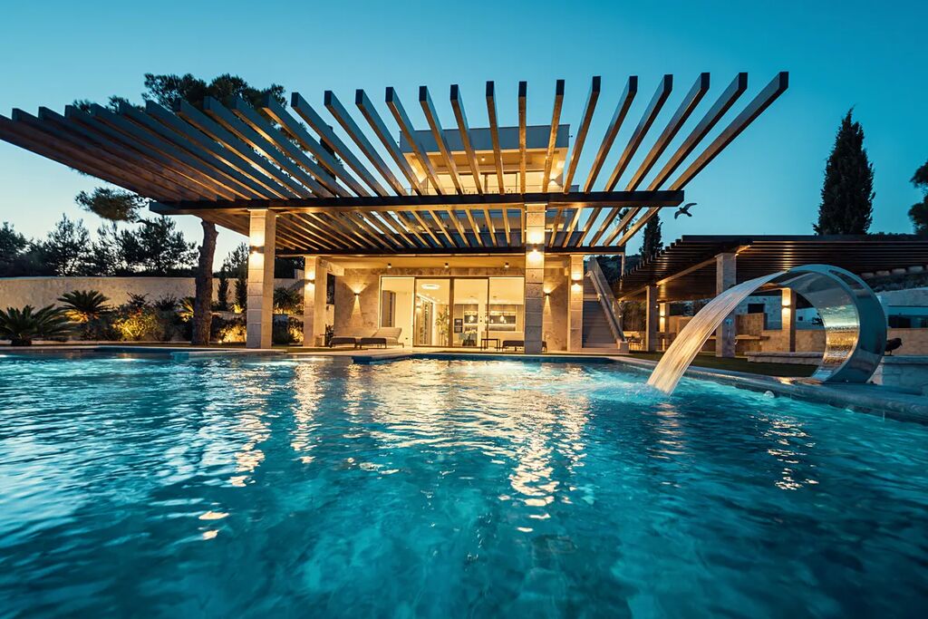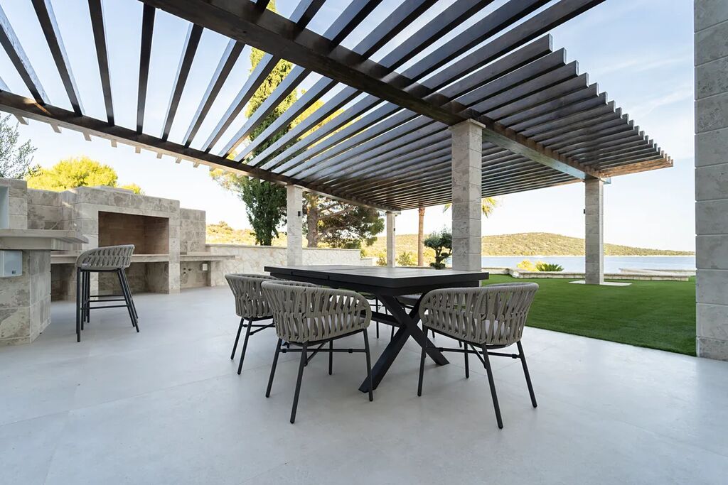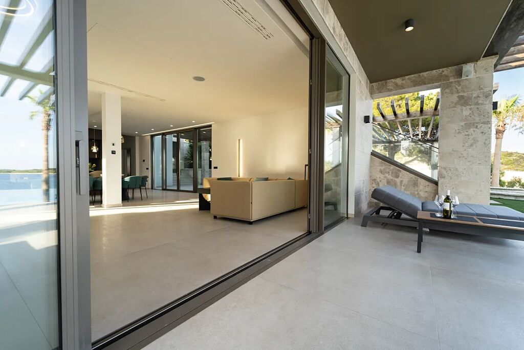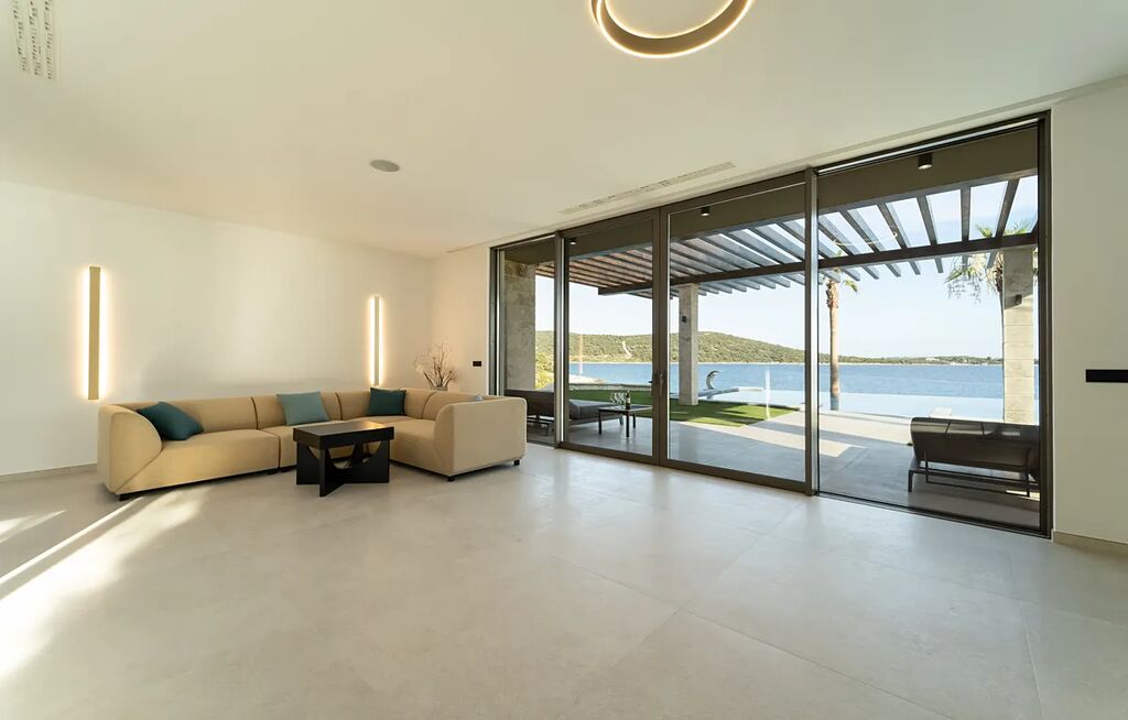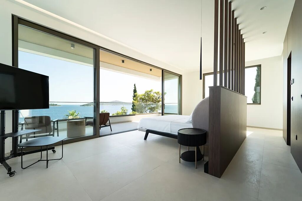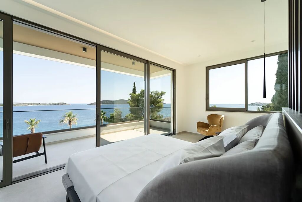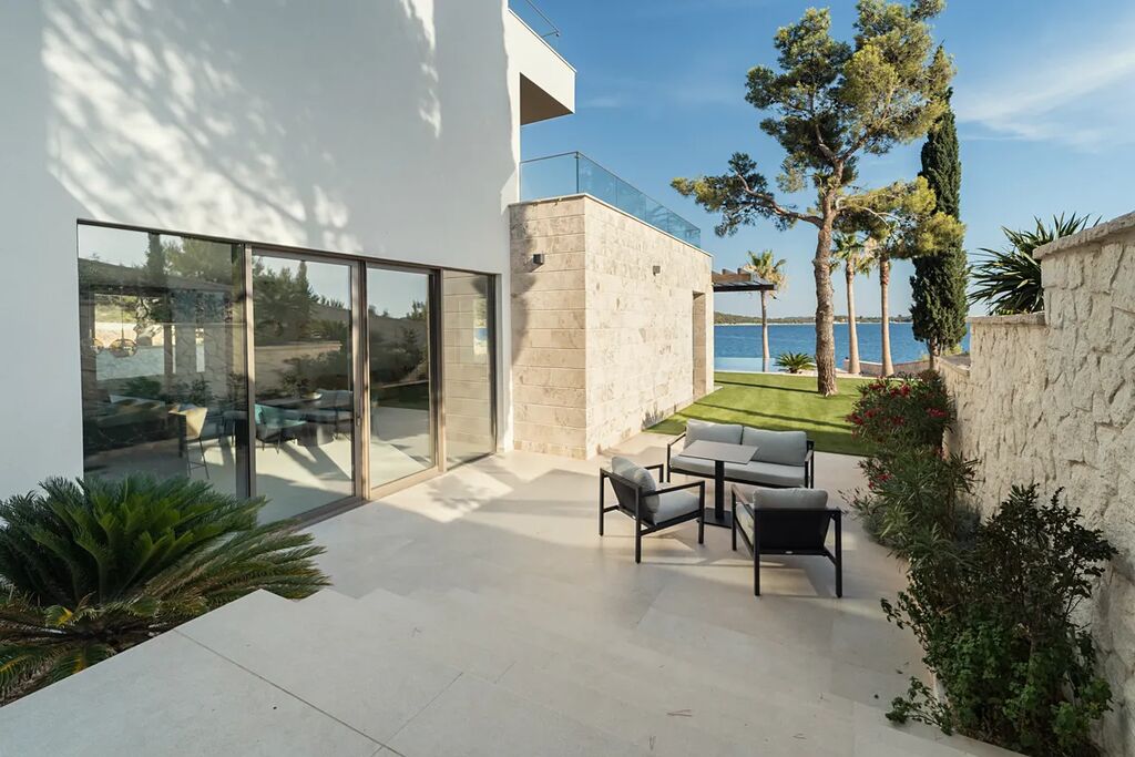 Unikátní luxusní vila s naprostým soukromím přímo na pláži s nádherným výhledem na moře. Hlavní vila má 400 m2 obytné plochy, vedlejší budova (pro hosty) 60 m2 obytné plochy. Domy obklopuje velkorysá zahrada o rozloze 1500 m2. V přízemí vily se nachází působivý obývací pokoj s otevřenou kuchyní a jídelním koutem (49,5 m2), vinotéka 21,6 m2, toaleta pro hosty, atrium (13,6 m2), wellness zóna s finskou saunou, infračervenou saunou a vířivkou (32,5 m2), fitness 22 m2, přímý přístup na velkou terasu s letní kuchyní, grilem a relaxační zónou, 100 m2 velký nekonečný vyhřívaný bazén s protiproudem, terasa pro opalování a relaxaci uprostřed středomořské vegetace. V prvním patře najdete tři pohodlné ložnice s vlastními koupelnami a přístupem na dvě terasy (7,36 m2 a 46,2 m2). Ve druhém patře je soukromá hlavní ložnice s šatnou a koupelnou, terasa s výhledem 50 m2 a další terasa 19,89 m2. Osobní klidová zóna s dechberoucím panoramatickým výhledem na moře a ostrovy. Ve vedlejším domku se nachází kuchyň o obývacím pokojem, ložnicí a koupelnou - ideální msto pro hosty nebo zaměstnance. Vila byla postavena v roce 2025 v luxusním, moderním provedení s použitím vysoce kvalitních materiálů a energeticky úsporných řešení. Obklopena středomořskou zahradou je oázou klidu poskytující absolutní soukromí. Tato úchvatná vila je ideální volbou pro ty, kteří hledají harmonii mezi moderním bydlením a přírodou. Je také skvělým místem pro dovolenou.