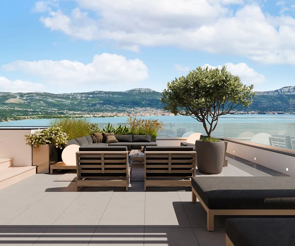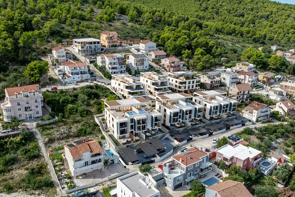 Luxusní apartmánový resort na ostrově Čiovo, 4 km od Trogiru, v městečku Arbanija, v atraktivní lokalitě s krásným výhledem na Jaderské moře a Kaštelský záliv. Resort nabízí apartmány různých velikostí, od 29 m² do 193 m². Všechny apartmány jsou vybaveny velkoformánovými hliníkovými okny s posuvnými systémy a markýzami, které poskytují ochranu před sluncem a soukromí. Každý apartmán je postaven podle nejvyšších standardů kvality, s pečlivě vybranými materiály, špičkovým architektonickým řešením, vynikající tepelnou a zvukovou izolaci. Architektura kombinuje moderní linie se středomořským šarmem, zatímco vnější prostory vyzařují eleganci a pečlivě navrženou estetiku. Prostorné pokoje plné přirozeného světla, pečlivě vybrané podlahy a vysoce kvalitní povrchové materiály vytvářejí pocit luxusu v každém koutě apartmánu. Velké prosklené plochy umožňují nerušený výhled na moře a okolí, prostorné terasy poskytují ideální místo k relaxaci. Interiér každého bytu byl pečlivě navržen tak, aby poskytoval dokonalou rovnováhu mezi estetikou a praktičností. Kombinuje moderní design s teplem přírodních materiálů a vytváří tak prostor, který je zároveň luxusní i pohodlný. Otevřený obývací pokoj propojený s kuchyní a jídelnou umožňuje plynulý a prostorný zážitek, zatímco ložnice jsou navrženy jako klidná útočiště s důrazem na pohodlí a soukromí. Koupelny jsou zařízeny ve stylu luxusního wellness s vysoce kvalitní sanitární keramikou a elegantními detaily. Zvláštní pozornost byla věnována ergonomii a funkčnosti prostoru, což zajišťuje maximální pohodlí pro každodenní život. Ať už se jedná o chytré osvětlovací systémy, moderní kuchyňské vybavení nebo prémiové textilie, které doplňují prostor, každý prvek byl navržen s cílem dosáhnout dokonalé harmonie. Výhled na moře, pobřeží a blízké ostrovy z každého kouta.