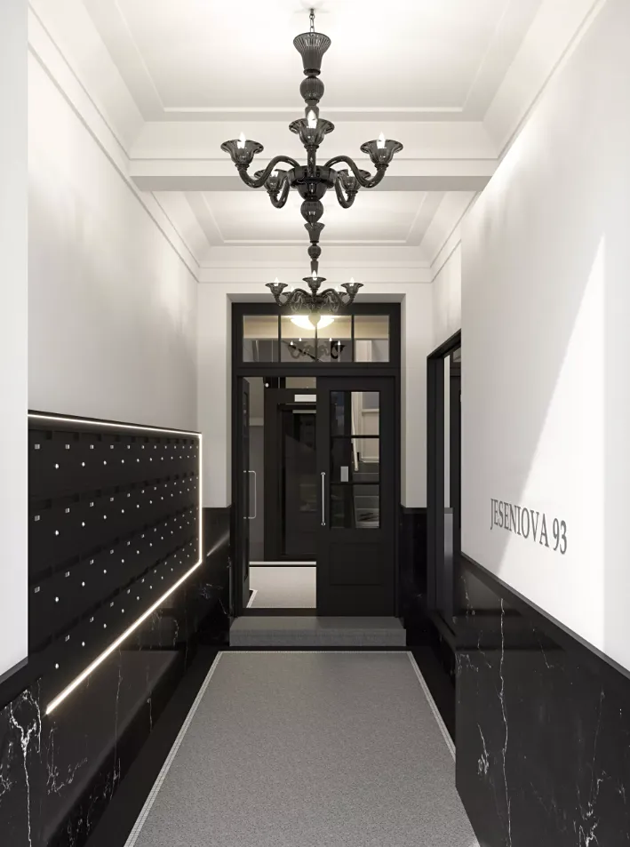 Dům prošel komplexní rekonstrukcí, která zahrnuje novou fasádu, modernizované společné prostory a sklepní kóje. Ve společných prostorách najdete elegantní mramorové obklady, designové osvětlení z broušeného skla, nový prosklený výtah, praktické schránky a bezpečnostní dveře z dubového dřeva. Oprava byla provedena s maximální péčí, aby vydržela na generace. Součástí domu je také klidný dvůr ve vnitrobloku, který slouží jako malá oáza pro společné užívání a relaxaci.