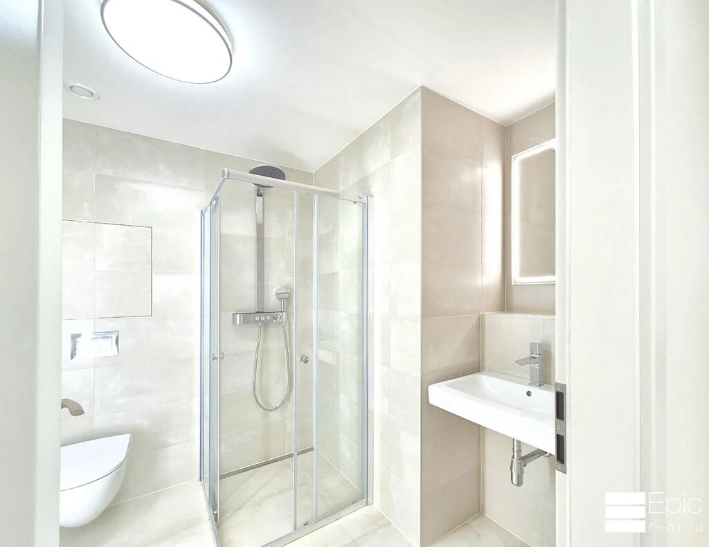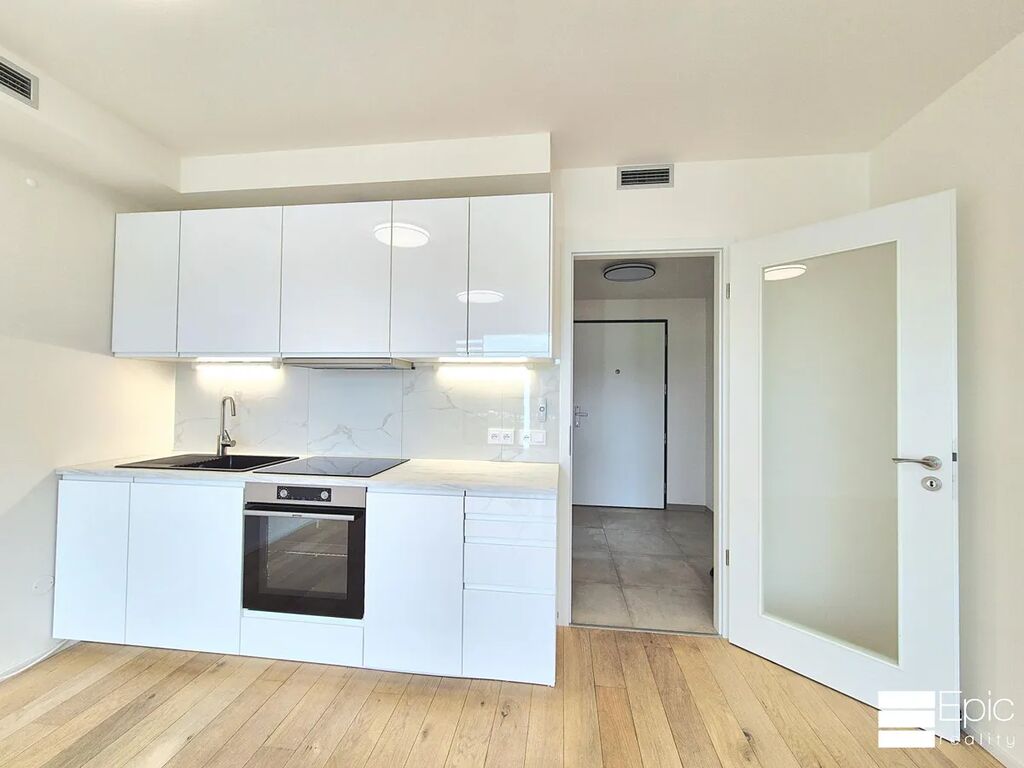 Kuchyňská linka je vybavena vestavěnými spotřebiči, v bytě jsou kvalitní podlahy a koupelna v moderním designu.