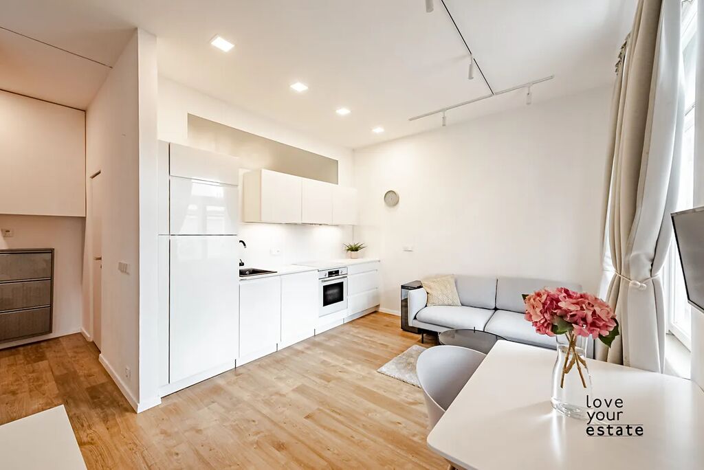 Ve výhradním zastoupení majitele nabízíme designový, plně zařízený byt 2+kk (s otevřenou dispozicí) v 5.NP kompletně zrekonstruované budovy v pražských Nuslích.