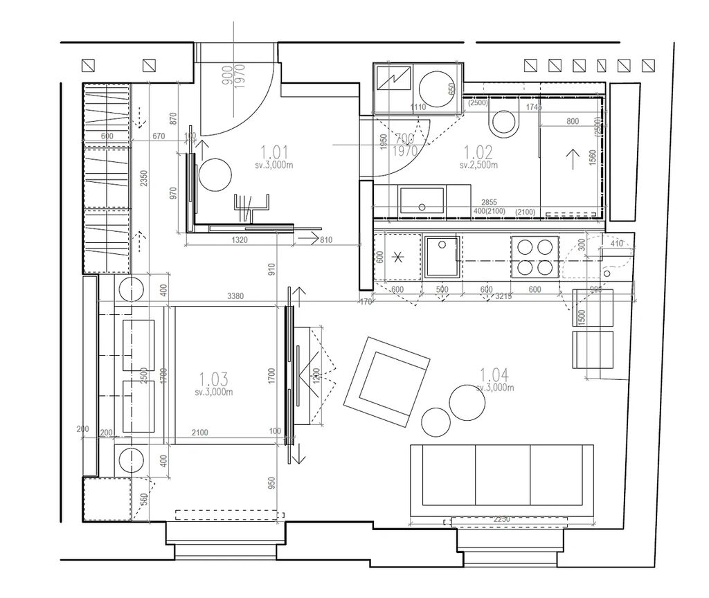 Dispozici tvoří předsíň, koupelna s walk in sprchovým koutem, obývací pokoj s kuchyňskou linkou a jídelním koutem, ložnice, která je částečně uzavíratelná. Světlá výška 3 metrů poskytuje vzdušnost i světlost celému prostoru. K bytu patří sklep o velikosti 4 m2.
