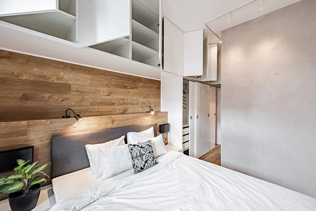 Vybavení je ve vysokém standardu, vše na míru od truhláře. V obývacím pokoji je TV i monitor na práci z domova, jídelní kout, sedačka. V ložnici nová postel s matrací.