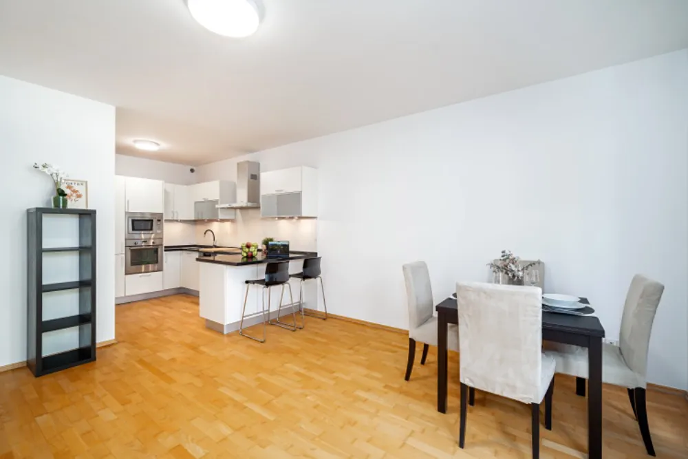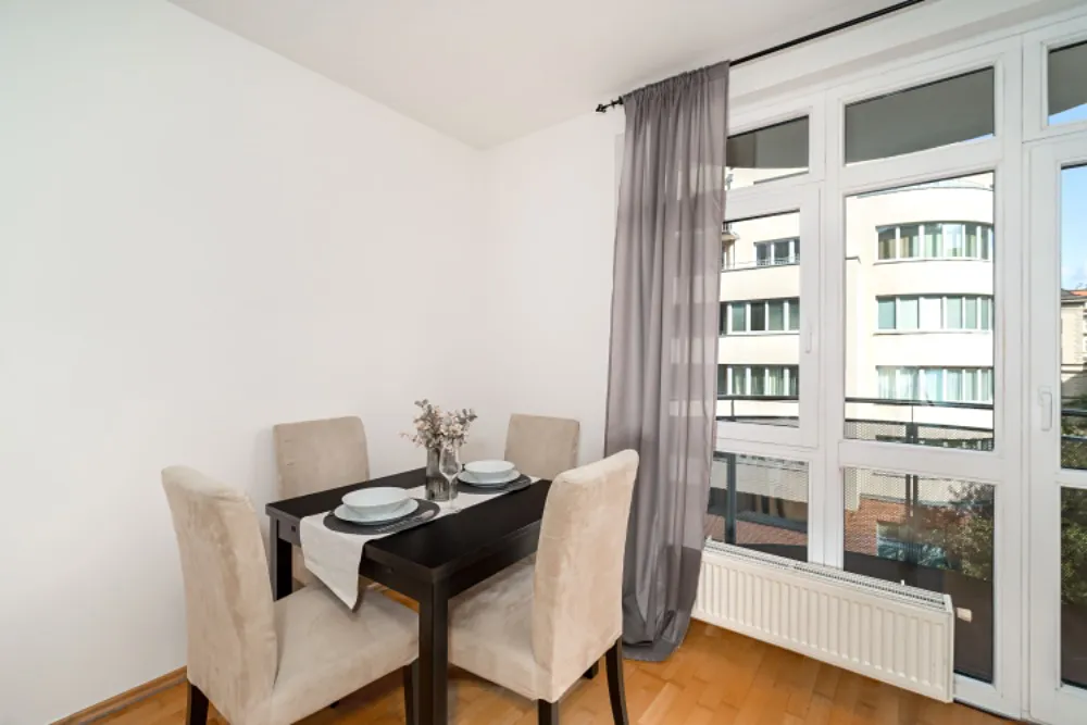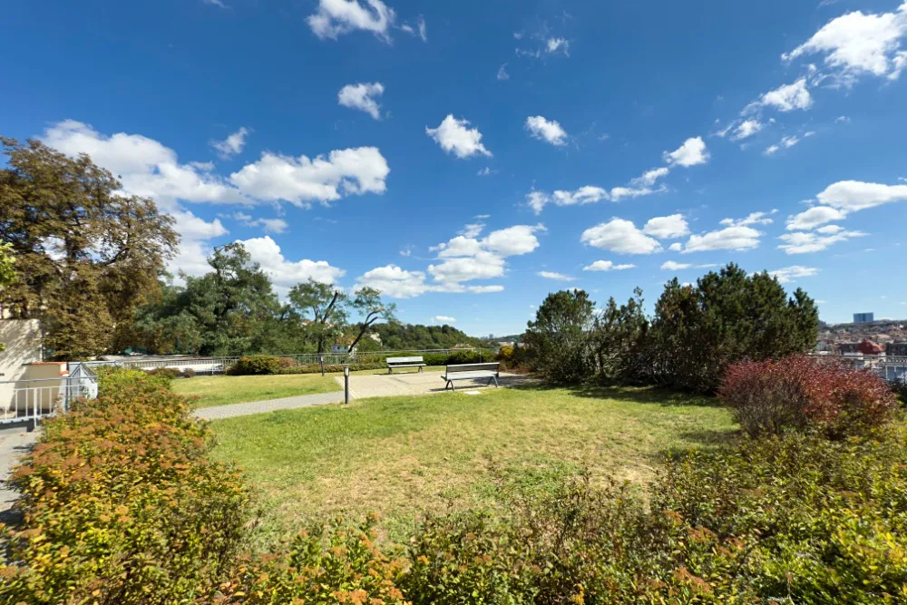 Dále kompletně vybavenou kuchyň, 2 světlé ložnice; z jedné z nich je vstup na balkón s výhledem na Vyšehrad, koupelnu s vanou a pračkou se sušičkou, samostatnou toaletu, šatnu a velkoryse prostornou vstupní halu s dostatkem úložných prostor.