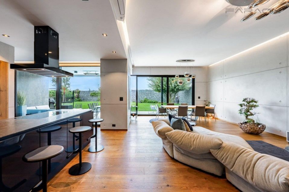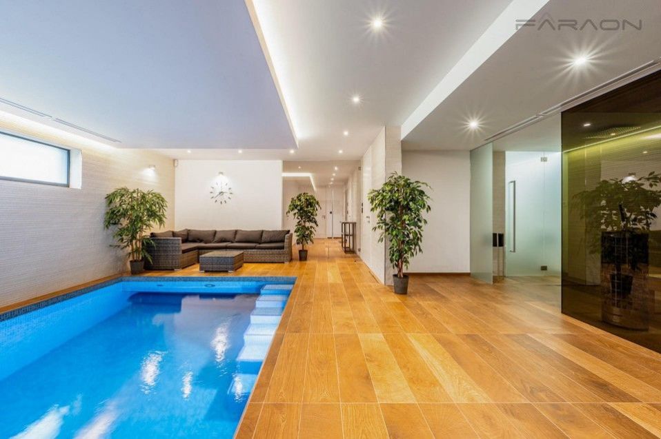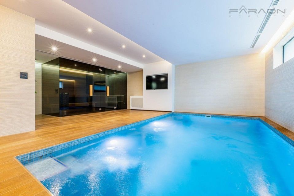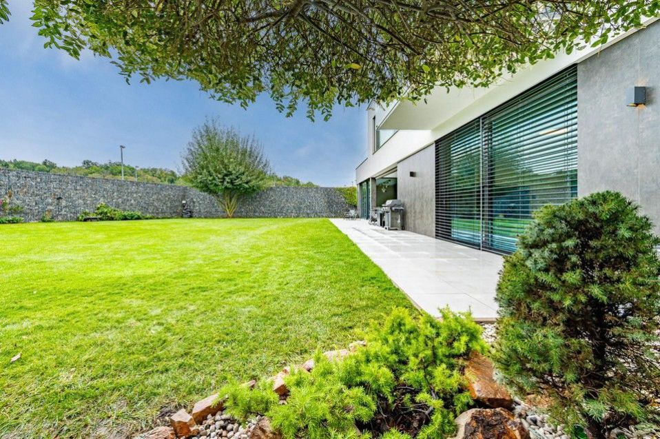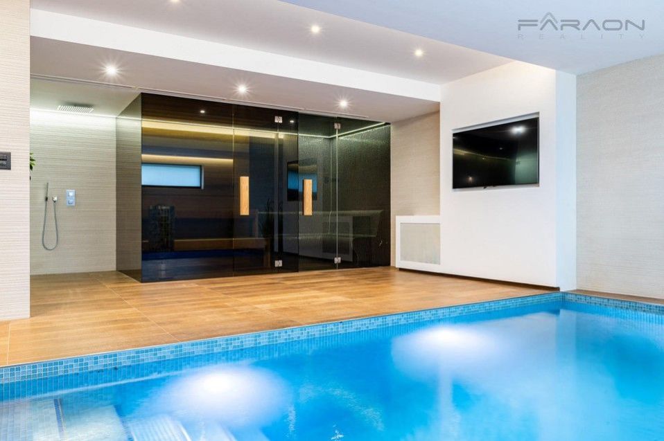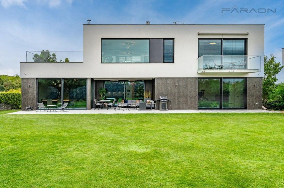 V -1 podlaží se nachází luxusní SPA zóna s vyhřívaným bazénem s protiproudem a podvodní roletou, technologií aktivního kyslíku bez chlóru, finskou a tureckou saunou, relaxační zónou a pokojem pro hosty. Dům dále disponuje garáží pro dva vozy a motocykl, technickou místností s prádelnou a kompletním moderním zázemím. Vybavení a technologie zahrnují tepelná čerpadla Mitsubishi vodavzduch pro ohřev vody i bazénu, klimatizaci Daikin, podlahové vytápění v celém domě, solární elektrárnu s výkonem 8,8 kW a inteligentní systém řízení domácnosti BTICINO, což zajišťuje vysoký komfort, bezpečí a nízké provozní náklady (cca 7 000 Kč měsíčně). Dům je vybaven centrálním systémem suchého vysávání Electrolux, EZS zabezpečovacím systémem Jablotron, kuchyňskou linkou z masivu kombinovanou s lesklým designem INDIGO BLUE se špičkovými spotřebiči Miele, zabudovanými šatními skříněmi NEXT125, vybraným osvětlením ARTEMIDE, betonovými stěrkami TwinArt a hliníkovými okny s izolačními trojskly, což podtrhuje moderní a luxusní charakter domu. Zahrada je pečlivě udržovaná a vybavená automatickou závlahou Rainbird a automatickou sekačkou Husqvarna, terasa nabízí prostor pro venkovní posezení s vyhříváním vzduchu pro chladné dny.
