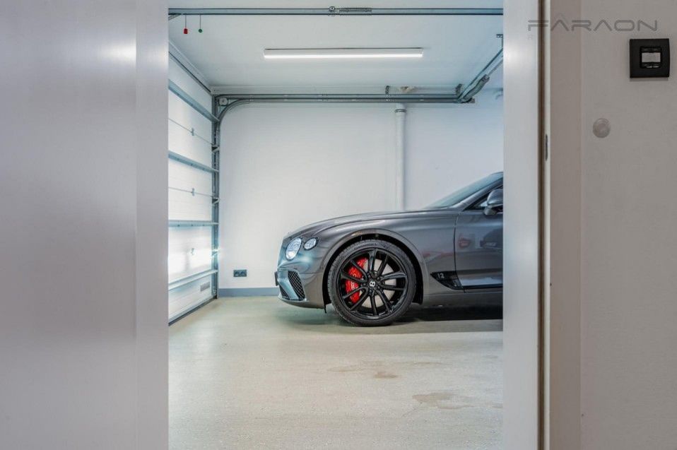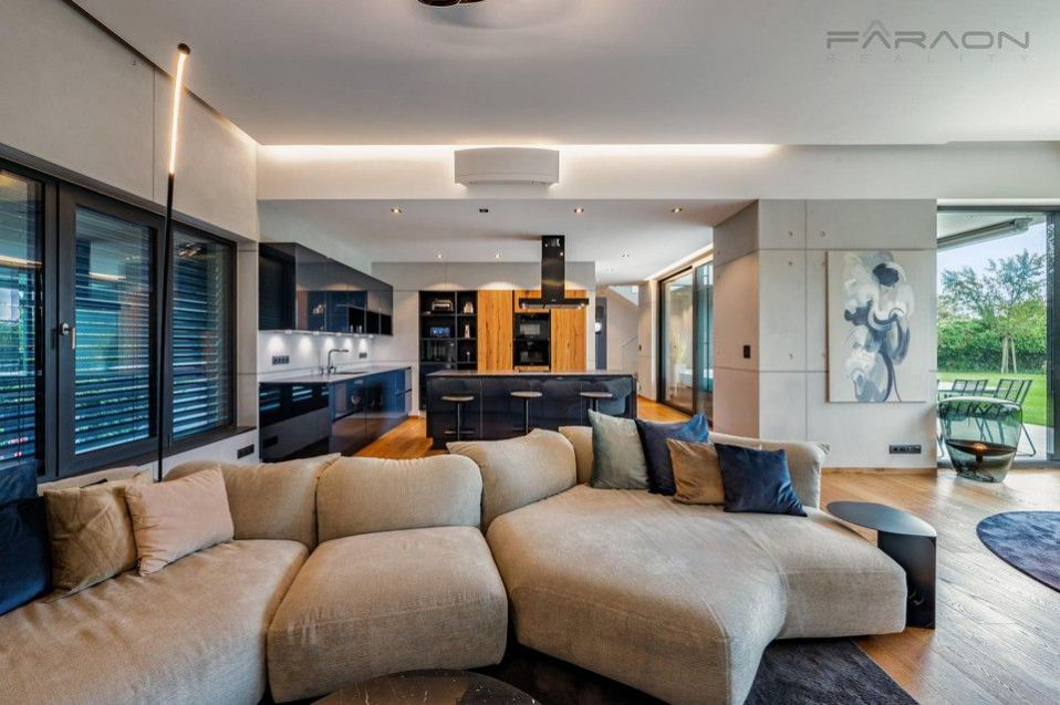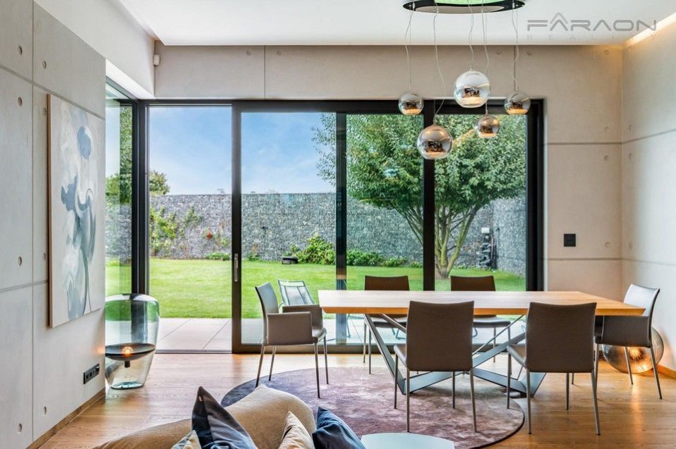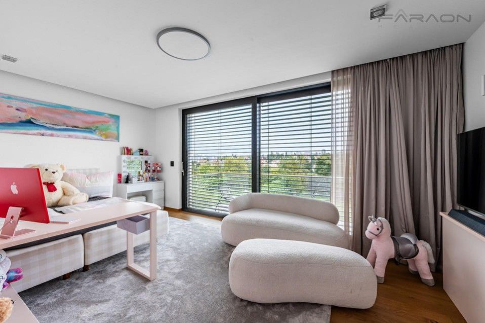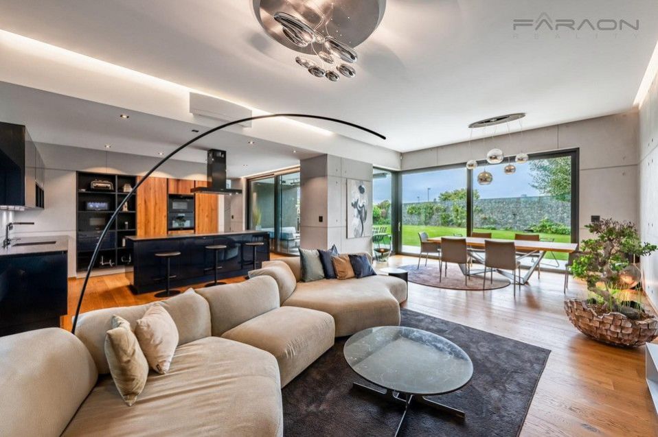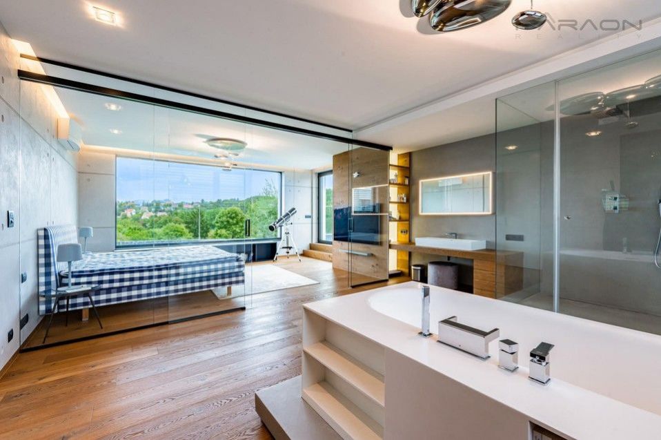 Dispozice domu je promyšlená a poskytuje komfortní prostor pro náročné. Dům je rozložen do tří podlaží, elegantně propojených designovým osvětleným schodištěm. Na dvou nadzemních podlažích se nacházejí tři ložnice, z nichž master ložnice tvoří exkluzivní privátní prostor s koupelnou s prostorovou vanou, sprchovým koutem a šatnou. Další dvě ložnice mají každá vlastní koupelnu a šatnu, což zajišťuje maximální soukromí pro všechny členy rodiny. Vstupní podlaží tvoří srdce domu reprezentativní otevřený koncept obývacího pokoje s jídelnou a kuchyní s přímým vstupem na prostornou terasu vybavenou letním posezením s vyhříváním, ideální pro užívání i během chladnějších měsíců. Terasu obklopuje pečlivě udržovaná zahrada s automatickou závlahou.