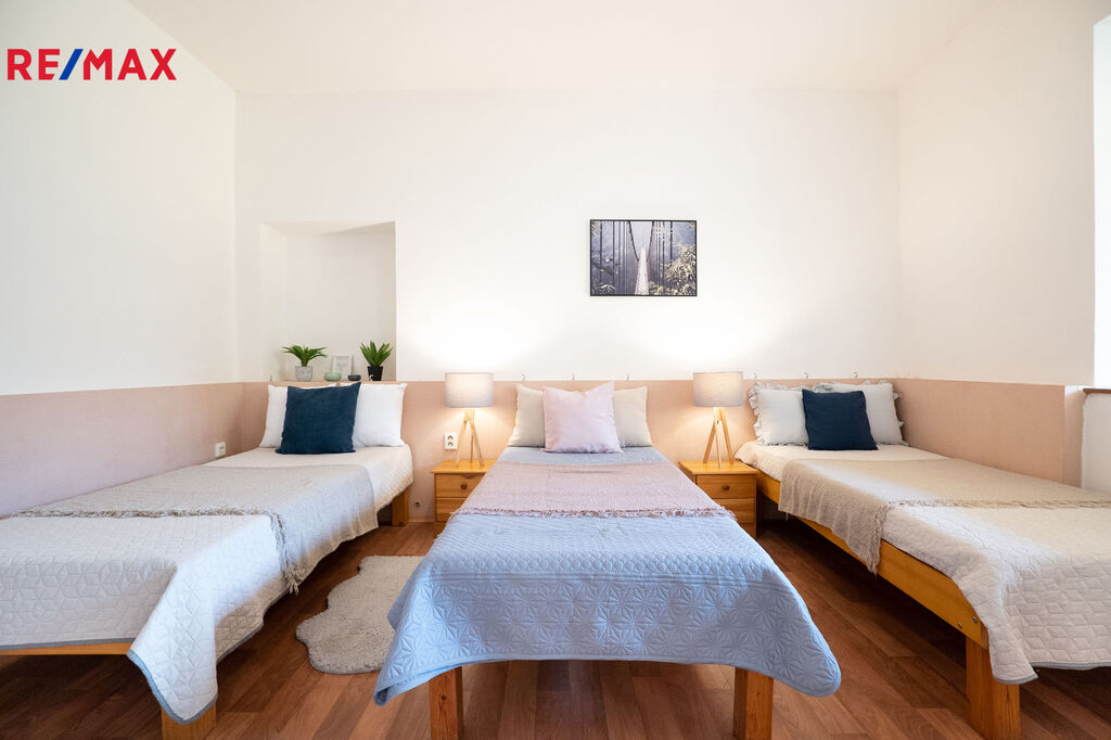 Dále je v 1. NP situován apartmán s 3x hostinským pokojem vždy po dvou lůžkách, se společnou koupelnou a kuchyňkou o celkové velikosti 68 m2.
