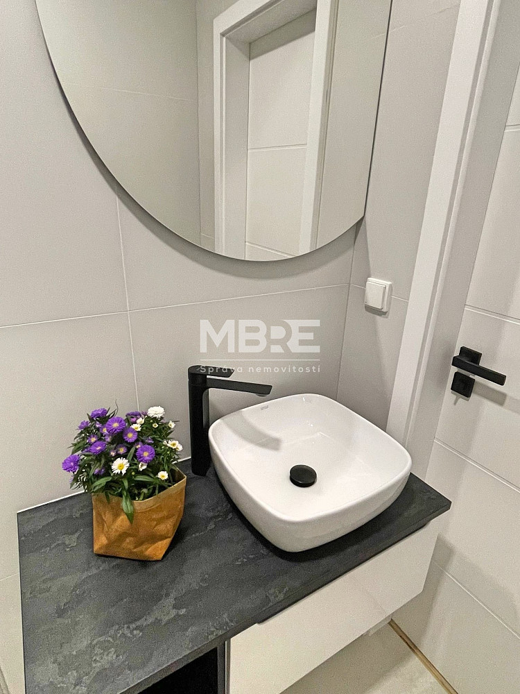 Stylová kuchyňská linka s vestavnými spotřebiči je navržena tak, aby nezabrala zbytečně moc místa, ale zároveň poskytla pohodlí při vaření. Zděná koupelna je vybavena sprchovým koutem a nechybí ani samostatná toaleta.