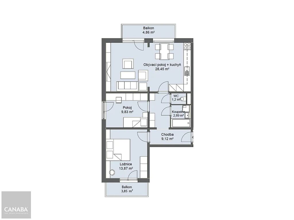Tento byt s celkovou plochou více jak 74 m² se nachází ve 2. nadzemním podlaží. Nabízí dispozici 3+kk a 2 prostorné balkony: