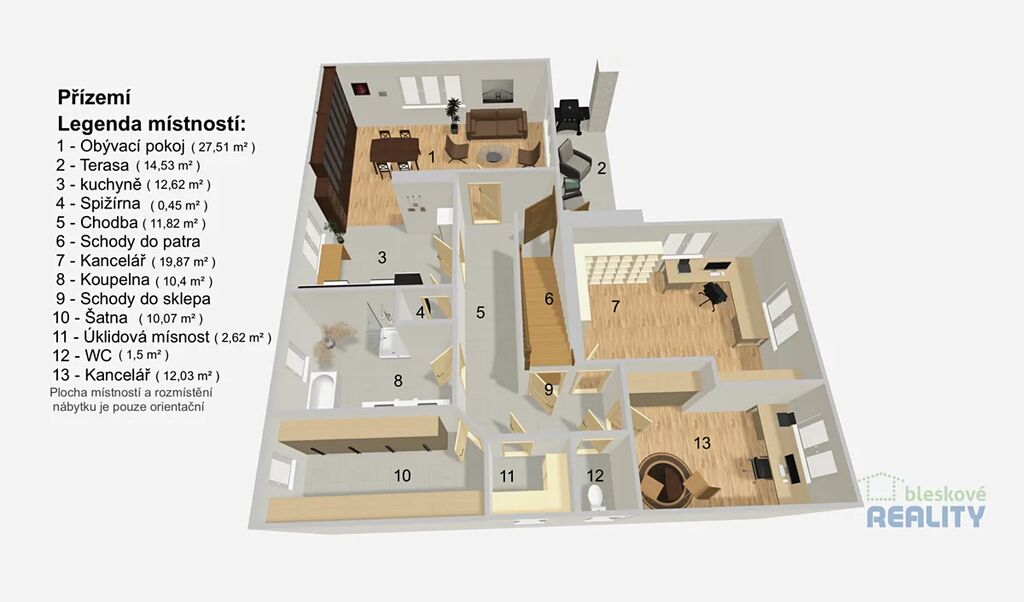 Dům je kompletně zařízený a vybavený. V přízemí se nachází prostorný obývací pokoj s přímým vstupem na terasu, plně vybavená kuchyň, koupelna a dvě samostatné kanceláře.